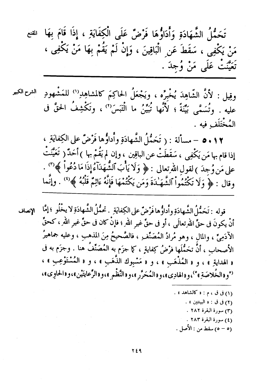 تَحَمُّلُ الشَّهادَةِ وَأدَاؤها فرض عَلَى الْكِفَايَةِ، إذَا قَامَ بِها مَن يَكْفِىِ، سَقَطَ عَنِ الْبَاقِينَ، وإنْ لَمْ يَقُف بِها مَنْ يَكْفِى، تَعَيَّنَتْ عَلى مَنْ وُجِدَ.