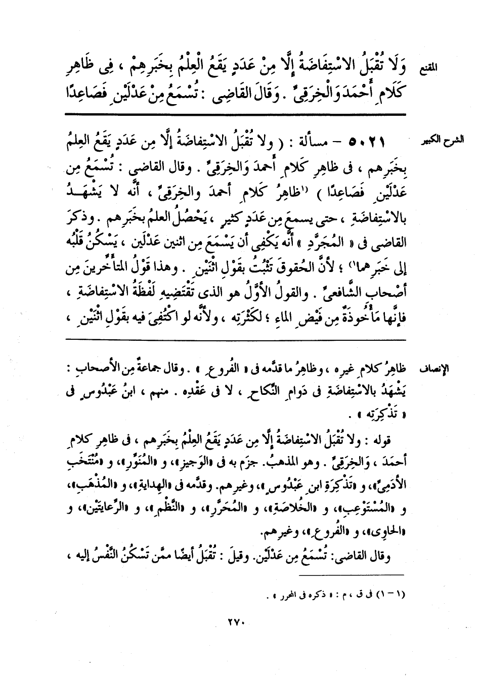 قوله: ولا تُقْبَلُ الاسْتِفاضَةُ إلَّا مِن عَدَدٍ يَقَعُ العِلْمُ بِخَبَرِهم، فى ظاهِرِ كلامِ أحمَدَ، وَالخِرَقى. وهو المذهبُ. جزَم به فى «الوَجيزِ»، و «المُنور»، و «مُنتخَبِ الأدَمِى»، و «تَذْكِرَةِ ابنِ عَبْدُوس»، وغيرِهم. وقدَّمه فى «الهِداية»، و «المُذْهَبِ»، و «المُستَوْعِبِ»، و «الخُلاصَةِ»، و «المُحَرَّرِ»، و «النَّظْم»، و «الرِّعايتَيْن»، و «الحاوِى»، و «الفُروعِ»، وغيرِهم.
