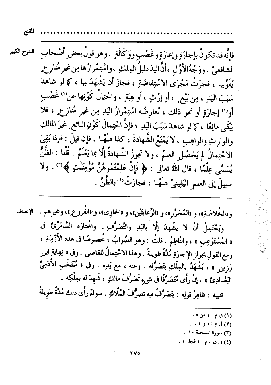 و «الخُلاصَةِ»، و «المُحررِ»، و «الرِّعايتَيْن»، و «الحاوِى»، و «الفُروعِ»، وغيرِهم. ويحتَمِلُ أنْ لا يشْهدَ إلَّا باليَدِ والتصَرُّفِ. واخْتارَه السَّامَرِّيُّ فى «المُسْتَوْعِبِ»، والنَّاظِمُ. قلتُ: وهو الصَّوابُ؛ خُصوصًا فى هذه الأزْمِنَةِ، ومع القولِ بجوازِ الإجارَةِ مُدَّةً طويلةً. وهذا الاحتِمالُ للقاضى. وفى «نِهايةِ ابنِ رَزِين»، يَشْهدُ بالمِلْكِ بتَصَرُّفِه. وعنه، مع يَدِه. وفى «مُنْتَخَبِ الأدَمِىِّ البَغْدادِىِّ»، إنْ رأى مُتَصَرفًا فى شئٍ تَصَرُّفَ مالكٍ، شَهِدَ له بمِلْكِه.