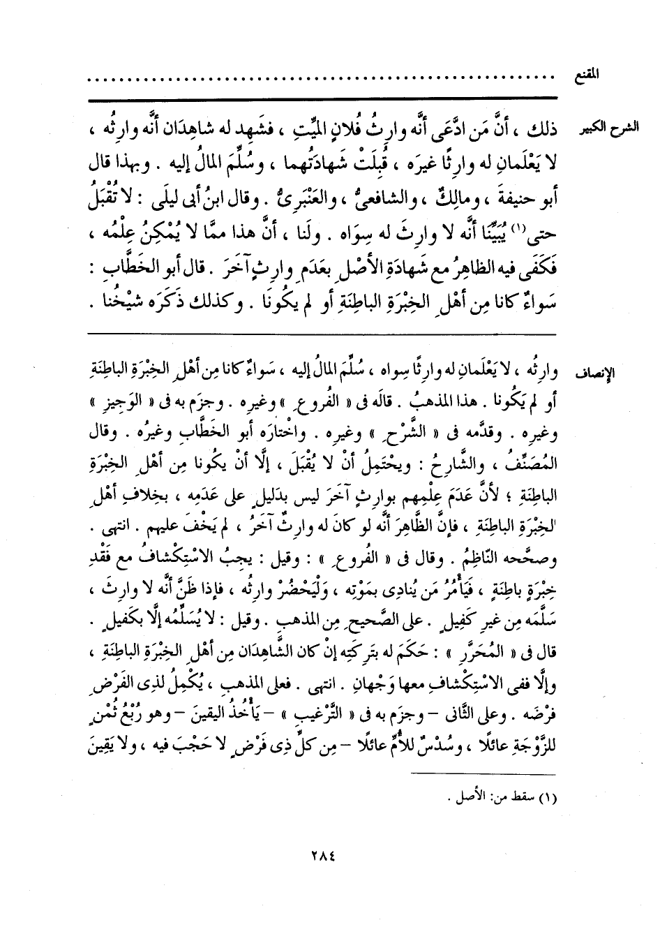 وارِثُه، لا يعلَمانِ له وارِثًا سِواه، سُلِّمَ المالُ إليه، سَواءٌ كانا مِن أهْلِ الخِبْرَةِ الباطِنَةِ أو لم يَكُونا. هذا المذهبُ. قالَه فى «الفُروعِ» وغيرِه. وجزَم به فى «الوَجِيزِ» وغيرِه. وقدَّمه فى «الشّرحِ» وغيرِه. واخْتارَه أبو الخَطَّابِ وغيرُه. وقال المُصَنِّفُ، والشَّارِحُ: ويحتَمِلُ أنْ لا يُقْبَلَ، إلَّا أنْ يكونا مِن أهْلِ الخِبْرَةِ الباطِنَةِ، لأنَّ عَدَمَ عِلْمِهم بوارِثٍ آخَرَ ليس بدَليل على عَدَمِه، بخِلافِ أهْلِ الخِبْرَةِ الباطِنَةِ، فإنَّ الظَّاهِرَ أنَّه لو كانَ له وارِثٌ آخَرُ، لم يَخْفَ عليهم. انتهى. وصحَّحه النّاظِمُ. وقال فى «الفُروعِ»: وقيل: يجِبُ الاسْتِكْشافُ مع فَقدِ خِبْرَةٍ باطِنَةٍ، فَيَأمُرُ مَن يُنادِى بمَوْتِه، وَلْيَحضُر وارِثُه، فإذا ظَنَّ أنَّه لا وارِثَ، سَلَّمَه مِن غيرِ كَفِيلٍ. على الصَّحيحِ مِن المذهبِ. وقيل: لا يُسَلِّمُه إلَّا بكَفيلٍ. قال فى «المُحَرَّرِ»: حَكَمَ له بتَرِكَتِه إنْ كان الشَّاهِدَان مِن أهْلِ الخِبْرَةِ الباطِنَةِ، وإلَّا ففى الاسْتِكْشافِ معها وَجْهانِ. انتهى. فعلى المذهبِ، يُكْمِلُ لذِى الفَرْضِ فرضَه. وعلى الثَّاني - وجزَم به فى «الترغيب» - يأخُذُ اليقينَ - وهو رُبْعُ ثمن للزَّوْجَةِ عائلًا، وسُدس للأمِّ عائلًا - مِن كلِّ ذِى فرضٍ لا حَجْبَ فيه، ولا يَقِينَ