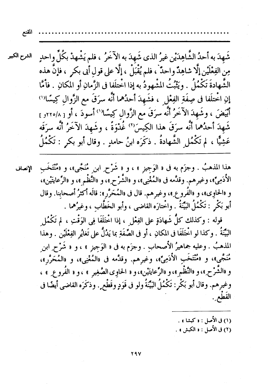 هذا المذهبُ. وجزَم به فى «الوَجِيزِ»، و «شَرحِ ابنِ مُنَجَّى»، و «مُنتخَبِ الأدَمِىِّ»، وغيرِ هم. وقدَّمه فى «المُغْنِى»، و «الشَّرح»، و «النَّظْمِ»، و «الرِّعايتَيْن»، و «الحاوِى»، و «الفُروعِ»، وغيرِهم. قال فى «المُحَرَّرِ»: قالَه أكثرُ أصحابِنا. وقال أبو بَكْر: تَكْمُلُ البَيِّنَةُ. واخْتارَه القاضى، وأبو الخَطابِ، وغيرُهما.