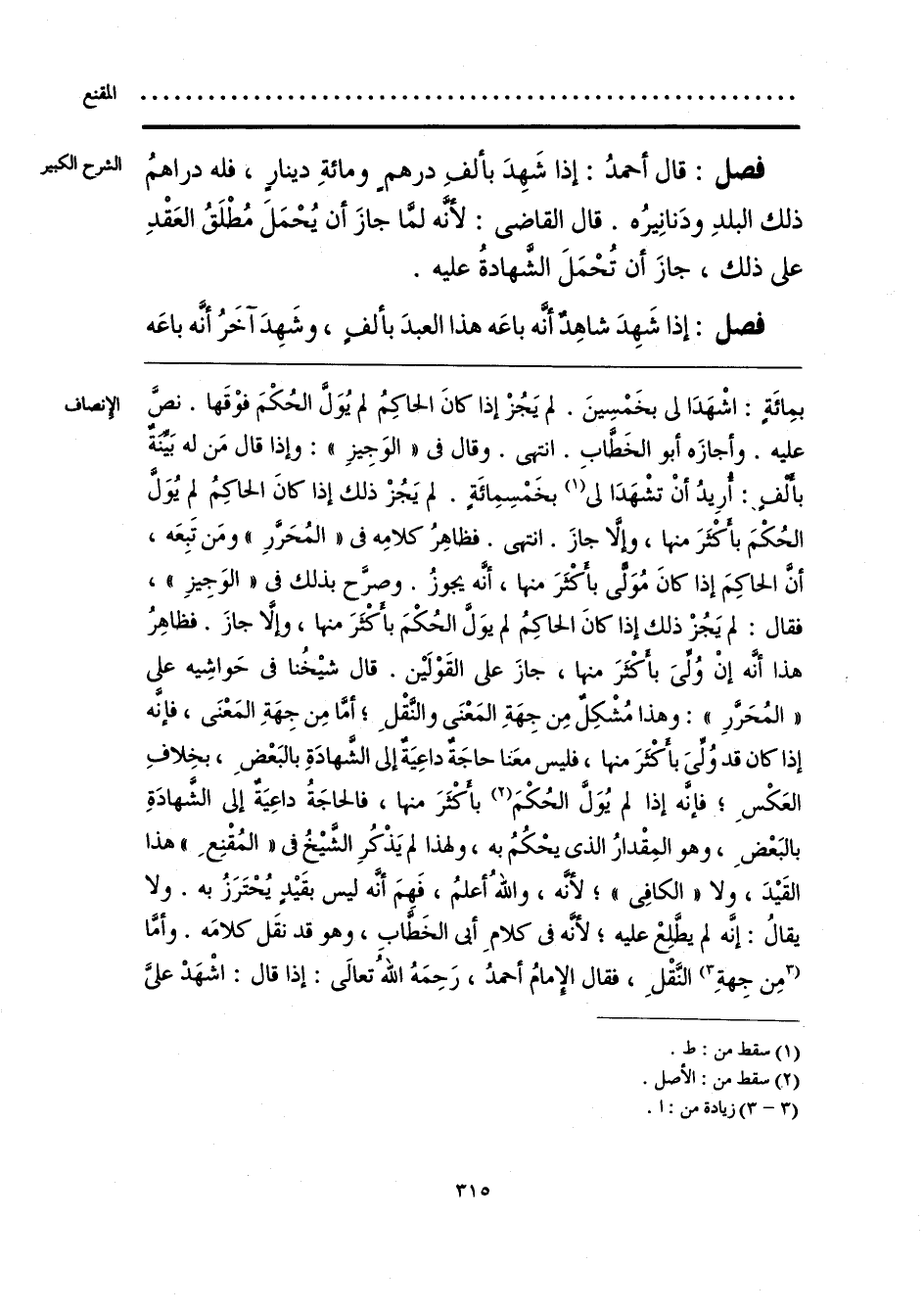 بمِائَةٍ: اشْهَدَا لى بخَمْسِينَ. لم يَجُزْ إذا كانَ الحاكِمُ لم يُوَلَّ الحُكْمَ فوْقَها. نصَّ عليه. وأجازَه أبو الخَطَّابِ. انتهى. وقال فى «الوَجِيزِ»: وإذا قال مَن له بَيِّنَةٌ بأَلْفٍ: أُرِيدُ أنْ تشْهَدَا لى (¬1) بخَمْسِمِائَةٍ. لم يَجُزْ ذلك إذا كانَ الحاكِمُ لم يُوَلَّ الحُكْمَ بأكْثَرَ منها، وإلَّا جازَ. انتهى. فظاهِرُ كلامِه فى «المُحَرَّرِ» ومَن تَبِعَه، أنَّ الحاكِمَ إذا كانَ مُوَلَّى بأكْثَرَ منها، أنَّه يجوزُ. وصرح بذلك فى «الوَجِيزِ»، فقال: لم يَجُزْ ذلك إذا كانَ الحاكِمُ لم يوَلَّ الحُكْمَ بأكْثَرَ منها، وإلا جازَ. فظاهِرُ هذا أنَّه إنْ وُلِّىَ بأكْثَرَ منها، جازَ على القَوْلَيْن. قال شيْخُنا فى حَواشِيه على «المُحَرَّرِ»: وهذا مُشْكِلٌ مِن جِهَةِ المَعْنَى والنَّقْلِ؛ أمَّا مِن جِهَةِ المَعْنَى، فإنَّه إذا كان قد وُلِّىَ بأكْثَرَ منها، فليس معَتا حاجَة داعِيَةٌ إلى الشهادَةِ بالبَعْضِ، بخِلافِ العَكْسِ؛ فإنَّه إذا لم يُوَلَّ الحُكْمَ (¬2) بأكْثَرَ منها، فالحاجَةُ داعِيَةٌ إلى الشَّهادَةِ بالبَعْضِ، وهو المِقْدارُ الذى يحْكُمُ به، ولهذا لم يَذْكُرِ الشَّيْخُ فى «المُقْنِعِ» هذا القَيْدَ، ولا «الكافِى»؛ لأنَّه، واللهُ أعلمُ، فَهِمَ أنَّه ليس بقَيْدٍ يُحْتَرَزُ به. ولا يقالُ: إنه لم يطَّلِعْ عليه؛ لأنَّه فى كلامِ أبي الخَطَّابِ، وهو قد نقَل كلامَه. وأمَّا [مِن جِهةِ] (¬3) النَّقْلِ، فقال الإمامُ أحمدُ، رَحِمَهُ اللهُ تعالَى: إذا قال: اشْهَدْ علىَّ