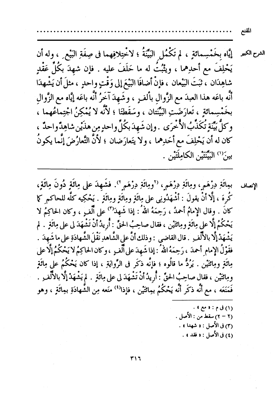 بمِائَةِ درْهَمٍ، ومِائَةِ درْهَمٍ، [ومِائَةِ درْهَمٍ] (¬1). فشَهِدَ على مِائَةٍ دُونَ مِائَةٍ، كُرِهَ، إَلَّا أنْ يقولَ: أشهَدُونِى على مِائَةٍ ومِائَةٍ ومِائَةٍ. يَحْكِيه كلَّه للحاكمِ كما كانَ. وقال الإمامُ أحمدُ، رَحِمَهُ اللهُ: إذا شَهِدَ (¬2) على أَلْفٍ، وكان الحاكِمُ لا يَحْكُمُ إلَّا على مِائَةٍ ومِائتَيْن، فقال صاحِبُ الحقِّ: أُرِيدُ أنْ تَشْهَدَ لى على مِائَةٍ. لم يَشْهَدْ إلَّا بالأَلْفِ. قال القاضى: وذلك أنَّ على الشَّاهدِ نَقْلَ الشَّهادَةِ على ما شَهِدَ. فقَوْلُ الإمامِ أحمدَ، رَحِمَهُ اللهُ: إذا شَهِدَ على أَلْفٍ، وكان الحاكِمُ لا يَحْكُمُ إلَّا على مِائَةٍ ومِائتَيْن. يَرُدُّ ما قالُوه؛ فإنَّه ذكَر فى الروايَةِ، إذا كان يَحْكُمُ على مِائَةٍ ومِائتَيْن، فقال صاحِبُ الحقِّ: أُيدُ أنْ تَشْهَدَ لى على مِائَةٍ. لم يَشْهَدْ إلَّا بالأَلْفِ. فَمَنَعَه، مع أنَّه ذكَر أنَّه يَحْكُمُ بمِائتَيْن، فإذا (¬3) منَعه مِن الشَّهادَةِ بمِائَةٍ، وهو
