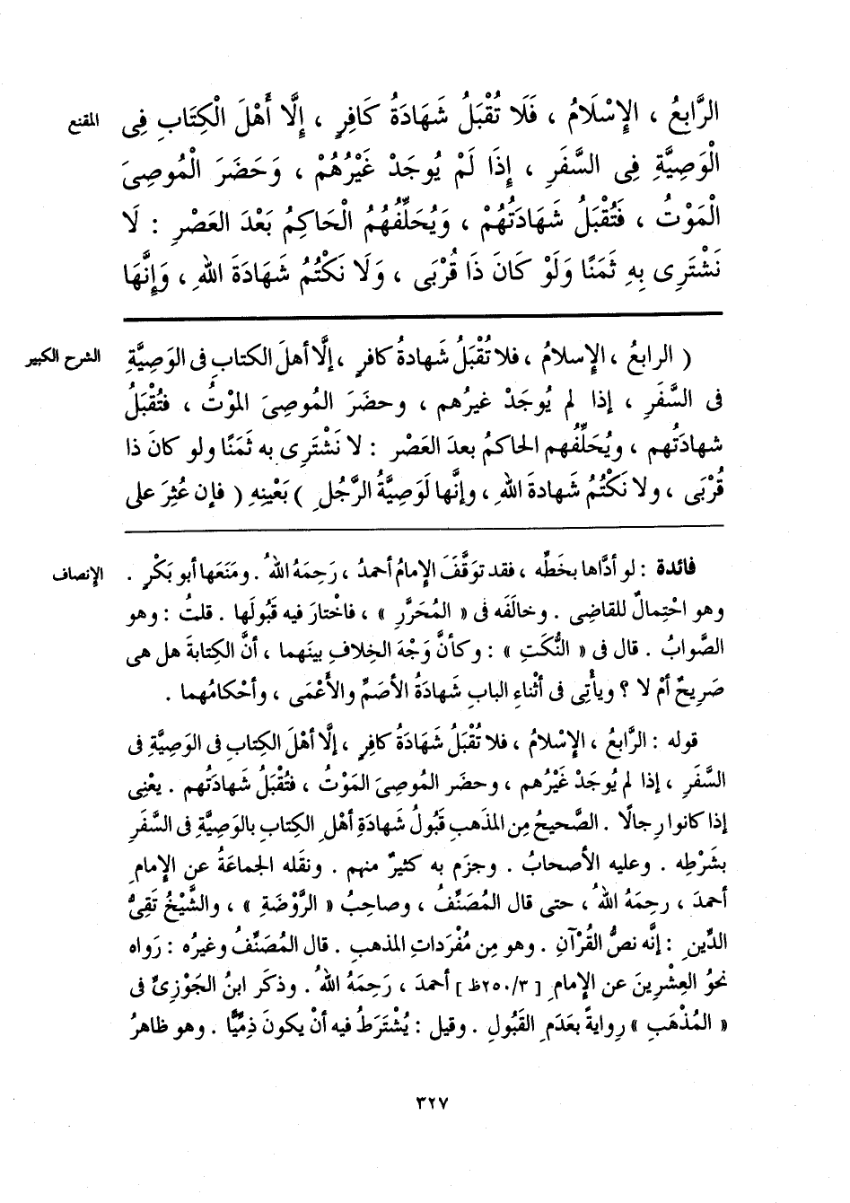 قوله: الرَّابعُ، الإسْلامُ، فلا تُقْبَلُ شَهَادَةُ كافِرٍ، إلَّا أهْلَ الكِتابِ فى الوَصِيَّةِ فى السَّفَرِ، إذا لم يُوجَدْ غَيْرُهم، وحضَر المُوصِىَ المَوْتُ، فتُقْبَلُ شَهادَتُهم. يعْنِى إذا كانوا رِجالًا. الصَّحيحُ مِن المذَهبِ قَبُولُ شَهادَةِ أهْلِ الكِتابِ بالوَصِيَّةِ فى السَّفَرِ بشَرْطِه. وعليه الأصحابُ. وجزَم به كثيرٌ منهم. ونقَله الجماعَةُ عن الإمامِ أحمدَ، رحِمَهُ اللهُ، حتى قال المُصَنِّفُ، وصاحِبُ «الرَّوْضَةِ»، والشَّيْخُ تَقِىُّ الدِّينِ: إنَّه نصَّ القُرْآنِ. وهو مِن مُفْرَداتِ المذهبِ. قال المُصَنِّفُ وغيرُه: رَواه نحوُ العِشْرِينَ عن الإمامِ أحمدَ، رَحِمَهُ اللهُ. وذكَر ابنُ الجَوْزِىِّ فى «المُذْهَبِ» رِوايةً بعَدَمِ القَبُولِ. وقيل: يُشْتَرَطُ فيه أنْ يكونَ ذِمِّيًّا. وهو ظاهرُ