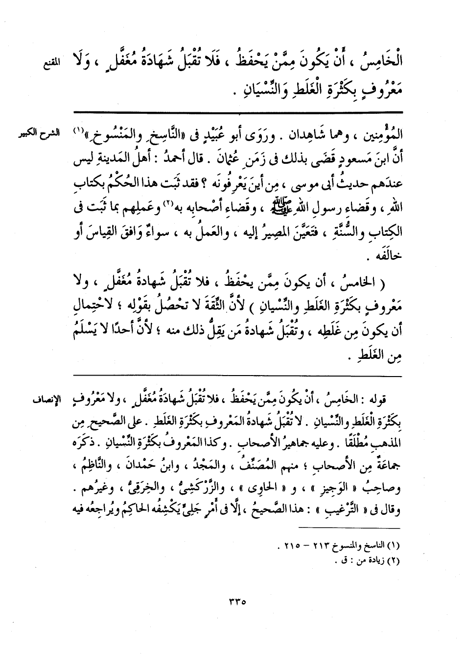 قوله: الخَامِسُ، أنْ يكونَ مِمَّن يَحْفَظُ، فلا تُقْبَلُ شَهادَةُ مُغفَّلٍ، ولا مَعْرُوفٍ بِكَثْرَةِ الْغلَطِ والنِّسْيانِ. لا تُقْبَلُ شَهادةُ المَعْروفِ بكَثْرَةِ الغلَطِ. على الصَّحيحِ مِن المذهبِ مُطْلَقًا. وعليه جماهيرُ الأصحابِ. وكذا المَعْروفُ بكَثْرَةِ النِّسْيانِ. ذكَرَه جماعَةٌ مِن الأصحابِ؛ منهم المُصَنِّفُ، والمَجْدُ، وابنُ حَمْدانَ، والنّاظِمُ، وصاحِبُ «الوَجِيزِ»، و «الحاوِى»، والزَّرْكَشِىُّ، والخِرَقِىُّ، وغيرُهم. وقال فى «التَّرْغيبِ»: هذا الصَّحيحُ، إلَّا فى أمْرٍ جَلِىٍّ يَكْشِفُه الحاكِمُ ويُراجِعُه فيه