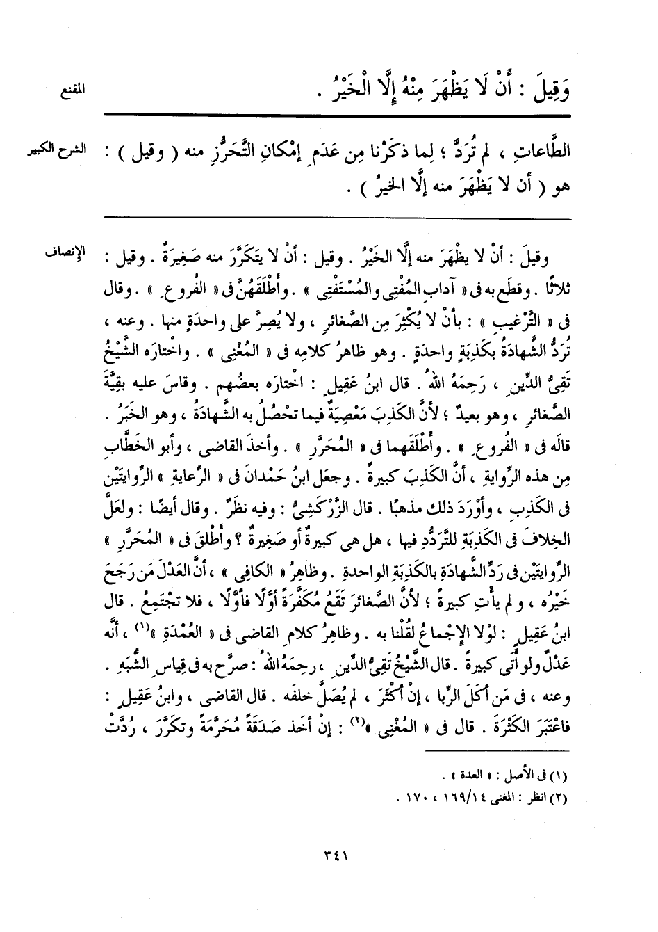 وقيلَ: أنْ لا يظْهَرَ منه إلَّا الخَيْرُ. وقيل: أنْ لا يتَكَرَّرَ منه صَغِيرَةٌ. وقيل: ثلاثاً. وقطَع به فى «آدابِ المُفْتِى والمُسْتَفْتِى». وأطْلَقَهُنَّ فى «الفُروعِ». وقال فى «التَّرْغيبِ»: بأنْ لا يُكْثِرَ مِن الصَّغائرِ، ولا يُصِرَّ على واحدَةٍ منها. وعنه، تُرَدُّ الشهادَةُ بكَذِبَةٍ واحدَةٍ. وهو ظاهرُ كلامِه فى «المُغْنِى». واخْتارَه الشَّيْخُ تَقِىُّ الدِّينِ، رَحِمَهُ اللَهُ. قال ابنُ عَقِيلٍ: اخْتارَه بعضُهم. وقاسَ عليه بقِيَّةَ الصَّغائرِ، وهو بعيدٌ؛ لأنَّ الكَذِبَ مَعْصِيَةٌ فيما تحْصُلُ به الشهادَةُ، وهو الخَبَرُ. قالَه فى «الفُروعِ». وأطْلَقَهما فى «المُحَرَّرِ». وأخذَ القاضى، وأبو الخَطَّابِ مِن هذه الرِّوايةِ، أنَّ الكَذِبَ كبيرةٌ. وجعَل ابنُ حَمْدانَ فى «الرِّعايةِ» الرِّوايتَيْن فى الكَذِبِ، وأوْرَدَ ذلك مذهبًا. قال الزَّرْكَشِىُّ: وفيه نظَرٌ. وقال أيضًا: ولعَلَّ الخِلافَ فى الكَذِبَةِ للتَّرَدُّدِ فيها، هل هى كبيرةٌ أو صَغِيرةٌ؟ وأَطْلقَ فى «المُحَرَّرِ» الرِّوايتَيْن فى رَدِّ الشَّهادَةِ بالكَذِبَةِ الواحدةِ. وظاهِرُ «الكافِى»، أنَّ العَدْلَ مَن رَجَحَ خَيْرُه، ولم يأْتِ كبيرةً؛ لأنَّ الصَّغائرَ تَقَعُ مُكَفَّرَةً أولًا فأوَّلًا، فلا تجْتَمِعُ. قال ابنُ عَقِيلٍ: لوْلا الإجْماعُ لقُلْنا به. وظاهِرُ كلامِ القاضى فى «العُمْدَةِ» (¬1)، أنَّه عَدْلٌ ولو أَتَى كبيرةً. قال الشَّيْخُ تَقِىُّ الدِّينِ، رحِمَهُ الله: صرَّح به فى قِياسِ الشُّبَهِ. وعنه، فى مَن أكَلَ الرِّبا، إنْ أكْثَرً، لم يُصَلَّ خلفَه. قال القاضىٍ، وابنُ عَقِيلٍ: فاعْتَبَرَ الكَثْرَةَ. قال فى «المُغْنِى» (¬2): إنْ أخَذ صَدَقَةً مُحَرَّمَةً وتكَرَّرَ، رُدَّتْ