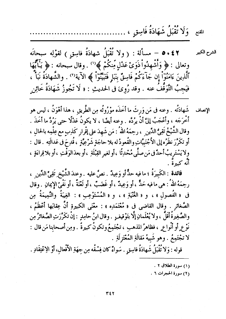 قوله: وَلا تُقْبَلُ شَهادَةُ فاسِقٍ. سَواءٌ كان فِسْقُه مِن جِهَةِ الأفْعالِ، أوْ الِاعْتِقَادِ.