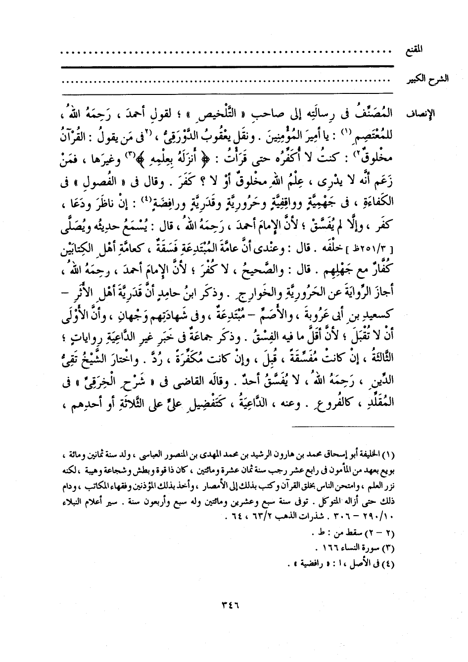 المُصَنِّفُ فى رِسالَتِه إلى صاحبِ «التَّلْخيصِ»؛ لقولِ أحمدَ، رَحِمَهُ اللهُ، للمُعْتَصِمِ (¬1): يا أمِيرَ المُؤْمِنِينَ. ونقَل يعْقُوبُ الدَّوْرَقِىُّ، [فى مَن يقولُ: القُرْآنُ مخْلوقٌ] (¬2): كنتُ لا أُكَفِّرُه حتى قَرَأْتُ: {أَنْزَلَهُ بِعِلْمِهِ} (¬3) وغيرَها، فمَنْ زَعَم أنَّه لا يدْرِى، عِلْمُ اللهِ مخْلوقٌ أوْ لا؟ كَفَرَ. وقال فى «الفُصولِ» فى الكَفاءَةِ، فى جَهْمِيَّةٍ وواقِفِيَّةٍ وحَرُورِيَّةٍ وقَدَرِيًةٍ ورافِضَةٍ (¬4): إنْ ناظَرَ ودَعَا، كفَر، وإلاَّ لم يُفَسَّقْ؛ لأنَّ الإمامَ أحمدَ، رَحِمَهُ اللهُ، قال: يُسْمَعُ حدِيثُه ويُصَلَّى خلْفَه. قال: وعنْدى أنَّ عامَّةَ المُبْتَدِعَةِ فَسَقَةٌ، كعامَّةِ أهْلِ الكِتابَيْن كُفَّارٌ مع جَهْلِهِم. قال: والصَّحيحُ، لا كُفْرَ؛ لأنَّ الإمامَ أحمدَ، رحِمَهُ اللهُ، أجازَ الرِّوايَةَ عن الحَرُورِيَّةِ والخَوارِجِ. وذكَر ابنُ حامِدٍ أنَّ قَدَرِيَّةَ أهْلِ الأَثَرِ - كسعيدِ بنِ أبى عَرُوبةَ، والأصَمِّ - مُبْتَدِعَةٌ، وفى شَهادَتِهم وَجْهانِ، وأنَّ الأوْلَى أنْ لا تُقْبَلَ؛ لأنَّ أقَلِّ ما فيه الفِسْقُ. وذكَر جماعَةٌ فى خَبَرِ غيرِ الدَّاعِيَةِ رِواياتٍ؛ الثَّالثَةُ، إنْ كانتْ مُفسِّقَةً، قُبِلَ، وإنْ كانت مُكَفِّرَةً، رُدَّ. واخْتارَ الشَّيْخُ تَقِىُّ الدِّينِ، رَحِمَهُ اللهُ، لا يُفَسَّقُ أحدٌ. وقالَه القاضى فى «شَرْحِ الْخِرَقِىِّ» فى المُقَلِّدِ، كالفُروعِ. وعنه، الدَّاعِيَةُ، كَتَفْضِيلِ علىَّ على الثَّلاثَةِ أو أحدِهم،