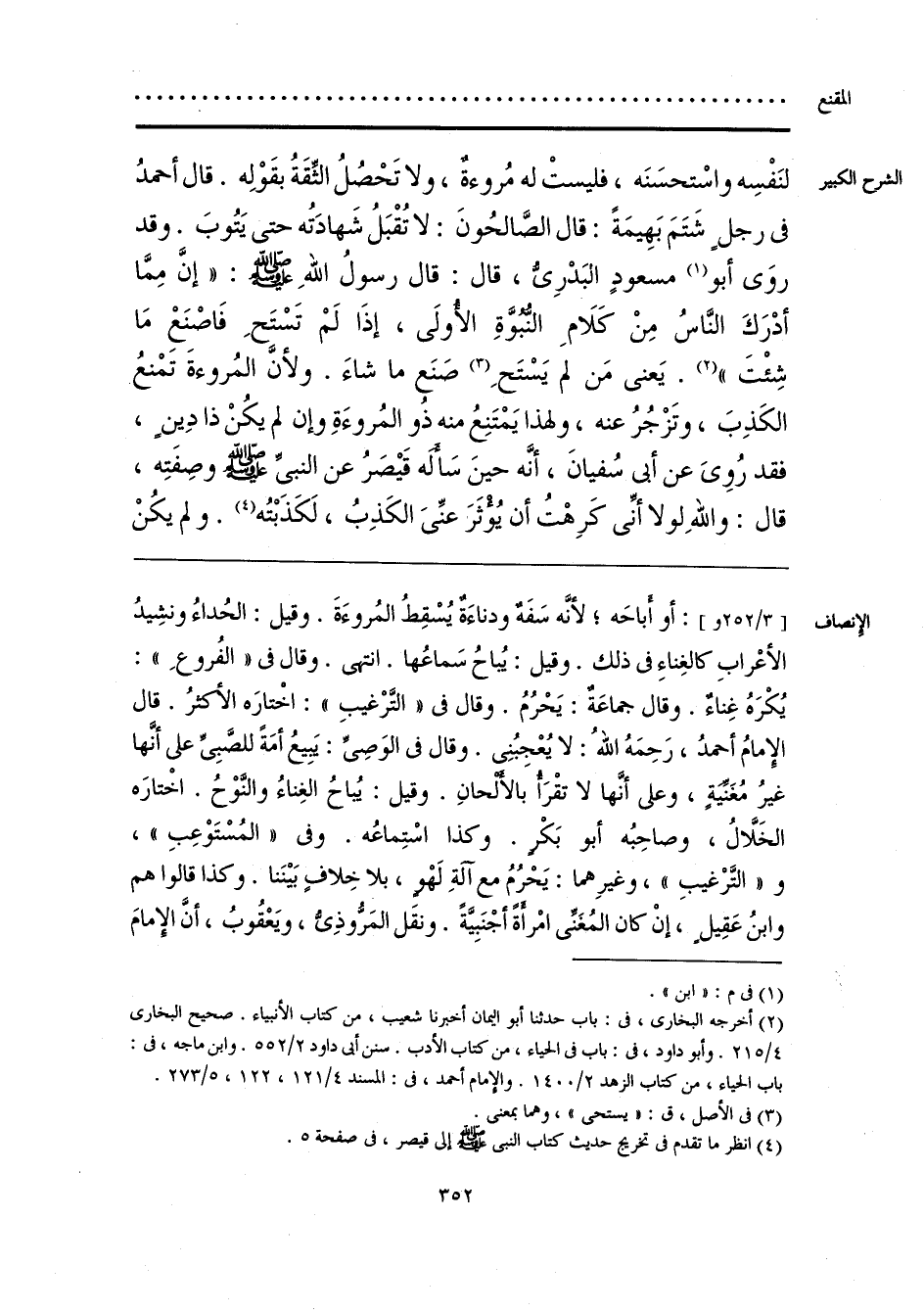 : أو أَباحَه؛ لأنَّه سَفَهٌ ودناءَةٌ يُسْقِطُ المُروءَةَ. وقيل: الحُداءُ ونشِيدُ الأعْرابِ كالغِناءِ فى ذلك. وقيل: يُباحُ سَماعُها. انتهى. وقال فى «الفُروعِ»: يُكْرَهُ غِناءٌ. وقال جماعَةٌ: يَحْرُمُ. وقال فى «التَّرْغيبِ»: اخْتارَه الأكثرُ. قال الإِمامُ أحمدُ، رَحِمَهُ اللهُ: لا يُعْجِبُنِى. وقال فى الوَصِىِّ: يَبِيعُ أمَةً للصَّبِىِّ على أنَّها غيرُ مُغَنِّيَةٍ، وعلى أنَّها لا تقْرَأُ بالألْحانِ. وقيل: يُباحُ الغِناءُ والنَّوْحُ. اخْتارَه الخَلَّالُ، وصاحِبُه أبو بَكْرٍ. وكذا اسْتِماعُه. وفى «المُسْتَوْعِبِ»، و «التَّرْغيبِ»، وغيرِهما: يَحْرُمُ مع آلةِ لَهْوٍ، بلا خِلافٍ بَيْنَنا. وكذا قالوا هم وابنُ عَقِيلٍ، إنْ كان المُغَنِّى امْرأةً أجْنَبِيَّةً. ونقَل المَرُّوذِىُّ، ويَعْقُوبُ، أنَّ الإمامَ