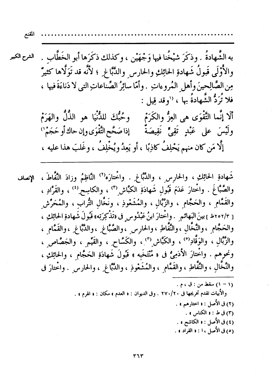شَهادةِ الحائِكِ، والحارِسَ، والدَّبَّاغَ. واخْتارَه (¬1) النَّاظِمُ وزادَ النَّفَّاطَ، والصَّبَّاغَ. واخْتارَ عَدَمَ قَبُولِ شَهادَةِ الكبَّاشِ (¬2)، والكاسِحِ (¬3)، والقَرَّادِ، والقَمَّامِ، والحَجَّامِ، والزَّبَّالِ، والمُشَعْوذِ، ونخَّالِ التُّرابِ، والمُحَرِّشِ بينَ البَهائمِ. واخْتارَ ابنُ عَبْدُوسٍ فى «تَذْكِرَتِه» قَبُولَ شَهادةِ الحائِكِ، والحَجَّامِ، والنَّخَّالِ، والنَّفَّاطِ، والحارِسِ، والصَّبَّاغِ، والدَّبَّاغِ، والقَمَّامِ، والزبَّالِ، والوَقَّادِ (¬4) والكَبَّاشِ (3)، والكَسَّاحِ، والقَيِّمِ، والجَصَّاصِ، ونحوِهم. واخْتارَ الأدَمِىَّ فى «مُنتَخَبِه» قَبُولَ شَهادَةِ الحَجَّامِ، والحائِكِ، والنَّخَّالِ، والنَّفَّاطِ، والقَمَّامِ، والمُشَعْوذِ، والدَّبَّاغِ، والحارسِ. واخْتارَ فى