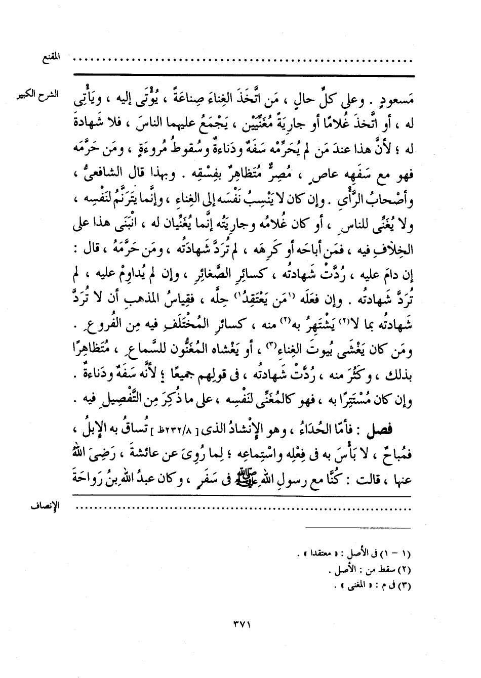 مَسعودٍ. وعلى كلِّ حالٍ، مَن اتَّخَذَ الغِناءَ صِناعَةً، يُؤْتَى إليه، ويَأْتِى له، أو اتَّخذَ غُلامًا أو جارِيَةً مُغَنَّييْن، يَجْمَعُ عليهما الناسَ، فلا شَهادةَ له؛ لأنَّ هذا عندَ مَن لم يُحَرِّمْه سَفَهٌ ودَناءةٌ وسُقوطُ مُروءَةٍ، ومَن حَرَّمَه فهو مع سَفَهِه عاصٍ، مُصِرٌّ مُتَظاهِرٌ بفِسْقِه. وبهذا قال الشافعىُّ، وأصْحابُ الرَّأْىِ. وإن كان لا يَنْسِبُ نَفْسَه إلى الغِناءِ، وإنَّما يتَرَنَّمُ لنَفْسِه، ولا يُغَنِّى للناسِ، أو كان غُلامُه وجارِيَتُه إنَّما يُغَنِّيان له، انْبَنَى هذا على الخِلافِ فيه، فمَن أباحَه أو كَرِهَه، لم تُرَدَّ شَهادَتُه، ومَن حَرَّمَهُ، قال: إن دامَ عليه، رُدَّت شَهادتُه، كسائِرِ الصَّغائِرِ، وإن لم يُداوِمْ عليه، لم تُرَدَّ شَهادتُه. وإن فعَلَه [مَن يَعْتَقِدُ] (¬1) حِلَّه، فقِياسُ المذهبِ أن لا تُرَدّ شَهادتُه بما لا يَشْتَهِرُ به (¬2) منه، كسائرِ المُخْتَلَفِ فيه مِن الفُروعِ. ومَن كان يَغْشَى بُيوتَ الغِناءِ (¬3)، أو يَغْشاه المُغَنُّون للسَّماعِ، مُتَظاهِرًا بذلك، وكَثُرَ منه، رُدَّتْ شَهادتُه، في قولِهم جميعًا؛ لأنَّه سَفَهٌ ودَناءةٌ. وإن كان مُسْتَتِرًا به، فهو كالمُغَنِّى لنَفْسِه، على ما ذُكِرَ مِن التَّفْصِيلِ فيه.