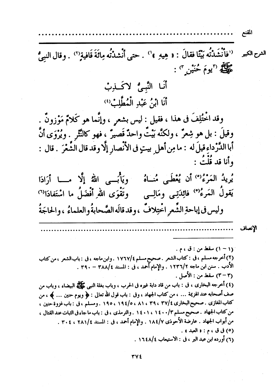 فأنْشَدْتُه بَيْتًا فقالَ: «هِيهِ» (¬1). حتى أنْشدْتُه مِائَةَ قَافيةٍ (¬2). وقال النبِىُّ - صلى الله عليه وسلم -[يومَ حُنَيْنٍ] (¬3)