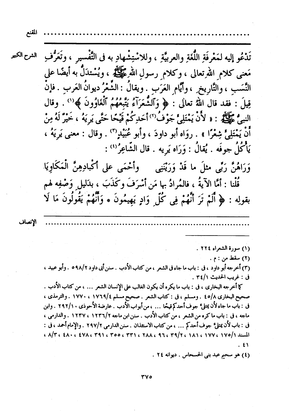 تَدْعُو إليه لمَعْرفَةِ اللُّغةِ والعربيَّةِ، وللاسْتِشْهادِ به في التَّفْسيرِ، وتَعَرُّفِ مَعنى كلامِ اللهِ تعالى، وكلامِ رسولِ اللهِ - صلى الله عليه وسلم -، ويُسْتدَلُّ به أيضًا على النَّسَبِ، والتَّارِيخِ، وأيَّام العَرَبِ. ويقالُ: الشِّعْرُ ديوانُ العَربِ. فإن قِيلَ: فقد قال اللهُ تعالى: {وَالشُّعَرَآءُ يَتَّبِعُهُمُ الْغَاوُونَ} (¬1). وقال النبىُّ - صلى الله عليه وسلم -: «لأنْ يَمْتَلِى جَوْفُ (¬2) أحَدِكُمْ قَيْحًا حَتَّى يَرِيَهُ، خَيْرٌ لَهُ مِنْ أنْ يَمْتَلِئَ شِعْرًا». روَاه أبو داودَ، وأبو عُبَيْدٍ (¬3). وقال: معنى يَرِيَهُ، يَأْكُلُ جوفَه. يُقالُ: وَرَاه يَرِيه. قال الشّاعِرُ (¬4):