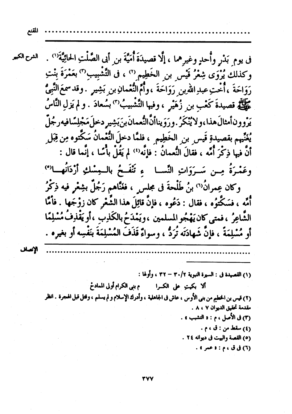 في يومِ بَدْرٍ وأُحدٍ وغيرِهما، إلَّا قصيدَةَ أُمَيَّةَ بنِ أبى الصَّلْتِ الحائِيَّةَ (¬1). وكذلك يُرْوَى شِعْرُ قَيْسِ بنِ الخَطيِمِ (¬2)، في التَّشْبِيبِ (3) بعَمْرَةَ بِنْتِ رَوَاحَةَ، أُخْتِ عبدِ الله بِنِ رَوَاحَةَ، وأُمِّ النُّعْمانِ بنِ بَشِير. وقد سمعَ النَّبِىُّ - صلى الله عليه وسلم - قصيدةَ كَعْبِ بنِ زُهَيْرٍ، وفيها التَّشْبيبُ (¬3) بسُعادَ. ولم يَزلِ النَّاسُ يَرْوون أمثالَ هذا، ولا يُنْكَرُ. ورَوَينا أنَّ النُّعمانَ بنَ بَشِير دخلَ مَجْلِسًا فيه رجُلٌ يُغنِّيهم بقصيدةِ قَيسِ بنِ الخَطِيمِ، فلمَّا دخلَ النُّغمانُ سَكَّتوه مِن قِبَلِ أنَّ فيها ذِكْرَ أمِّه، فقالَ النُّعمانُ: فإنه (¬4) لم يَقُل بأْسًا، إنَّما قال: