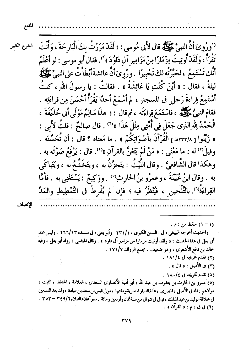[ورُوِىَ أن النبَّى - صلى الله عليه وسلم - قال لأبى مُوسى «لَقَدْ مَرَرْتُ بِكَ الْبَارِحَةَ، وَأنْتَ تَقْرَأُ، وَلَقَدْ أُوتِيتَ مِزْمَارًا مِنْ مَزَامِيرِ آلِ دَاوُدَ»] (¬1). فقال أبو موسى: لو أعْلَمُ أنك تَسْتَمِعُ، لحَبَّرْتُه لكَ تَحْبِيرًا. ورُوِىَ أنَّ عائشةَ أبْطَأتْ على النبىِّ - صلى الله عليه وسلم - ليلةً، فقال: «أيْنَ كُنْتِ يَا عَائِشَةُ». فقالتْ: يا رسولَ اللهِ، كنتُ أسْتَمِعُ قِراءةَ رَجلٍ في المسجدِ، لم أسْمَعْ أحدًا يَقْرأُ أحْسَنَ مِن قراءَتِه. فقامَ النبىُّ - صلى الله عليه وسلم -، فاسْتَمَعَ قِراءَتَه، ثم قال: «هذَا سَالِمٌ مَوْلَى أبى حُذَيْفَةَ، الْحَمْدُ لِلّهِ الذِى جَعَلَ فِى أمَّتِى مِثْلَ هَذَا» (¬2). قال صالحٌ: قلتُ لأبِى: «زَيِّنُوا الْقُرْآنَ بأصْوَاتِكُمْ». ما مَعناه؟ قال: أن تُحَسِّنَه. وقيل (¬3) له: ما مَعْنَى: «مَنْ لَمْ يَتَغَنَّ بالقرآنِ» (¬4). قال: يَرْفَعُ صَوْتَه به. وهكذا قال الشَّافعىُّ. وقال اللَّيْثُ: يتَحزَّنُ به، ويتَخَشَّعُ به، ويَتَباكَى به. وقال ابنُ عُيَيْنَةَ، وعمرُو بنُ الحارِثِ (¬5). ووَكِيعٌ: يَسْتَغْنِى به. فأمَّا القِراءَةُ (¬6) بالتَّلْحينِ، فيُنْظَرُ فيه؟ فإن لم يُفرِطْ في التَّمْطِيطِ والمَدِّ