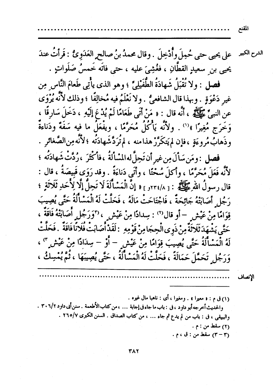 فصل: ولا تُقْبَلُ شَهادَةُ الطُّفَيْلىِّ؛ وهو الذى يأْتِى طَعامَ النَّاسِ مِن غيرِ دَعْوَةٍ. وبهذا قال الشافعىُّ. ولا نَعْلَمُ فيه مُخالِفًا؛ وذلك لأنَّه يُرْوَى عنِ النبىِّ - صلى الله عليه وسلم - أنَّه قال: «مَنْ أتَى طَعَامًا لَمْ يُدْعَ إلَيْهِ، دَخَلِ سَارِقًا، وَخرَج مُغِيرًا» (¬1). ولأنَّه يأكُلُ مُحَرَّمًا، ويفْعَلُ ما فيه سَفهٌ ودَناءةٌ وذَهابُ مُروءَةٍ، فإن لم يَتكَرَّرْ هذا منه، لم تُرَدَّ شَهادَته؛ لأنَّه مِن الصَّغائرِ.