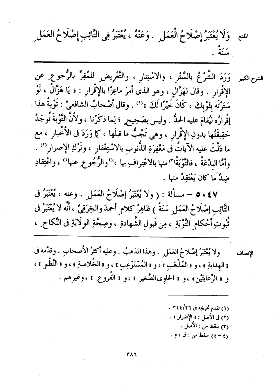 ولا يُعْتَبَرُ إصْلاحُ العَمَلِ. وهذا المذهبُ. وعليه اكثرُ الأصحابِ. وقدَّمه فى «الهِدايةِ»، و «المُذْهَبِ»، و «المُسْتَوْعِبِ»، و «الخُلاصةِ»، و «النَّظْمِ»، و «الرِّعايتَيْن»، و «الحاوِى الصَّغيرِ»، و «الفُروعِ»، وغيرِهم.