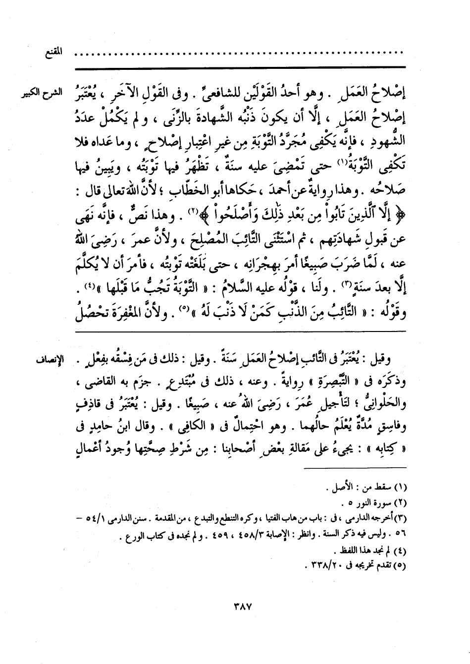وقيل: يُعْتَبَرُ فى التَّائبِ إصْلاحُ العَمَلِ سَنَةً. وقيل: ذلك فى مَن فِسْقُه بفِعْلٍ. وذكَرَه فى «التَّبْصِرَةِ» رِوايةً. وعنه، ذلك فى مُبْتَدِعٍ. جزَم به القاضى، والحَلْوانِّىَّ؛ لتَأجيلِ عُمَرَ، رَضِىَ اللهُ عنه، صَبِيغاً. وقيل: يُعْتَبَرُ فى قاذِفٍ وفاسقٍ مُدَّةٌ يُعْلَمُ حالُهما. وهو احْتِمالٌ فى «الكافِى». وقال ابنُ حامِدٍ فى «كِتابِه»: يجئُ على مَقالةِ بعْضِ أصْحابِنا: مِن شَرْطِ صِحَّتِها وُجودُ أعْمالٍ