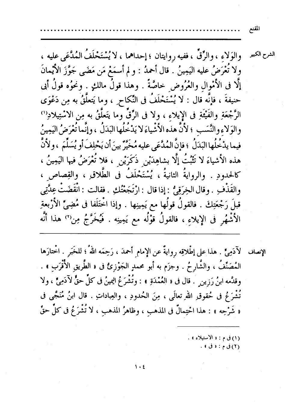 لآدَمِىٍّ. هذا على إطْلاقِه رِوايةٌ عن الإِمامِ أحمدَ، رَحِمَه اللَّهُ؛ للخَبَرِ. اخْتارَها المُصَنِّفُ، والشَّارِحُ. وجزَم به أبو محمدٍ الجَوْزِىُّ فى «الطَّريقِ الأَقْرَبِ». وقدَّمه ابنُ رَزِينٍ. قال فى «العُمْدَةِ»: وتُشْرَعُ اليمينُ فى كلِّ حقٍّ لآدَمِىٍّ، ولا تُشْرَعُ فى حُقوقِ اللَّهِ تعالَى، مِنَ الحُدودِ، والعِباداتِ. قال ابنُ مُنَجَّى فى «شَرْحِه»: هذا احْتِمالٌ فى المذهبِ، وظاهرُ المذهبِ، لا تُشْرَعُ فى كلِّ حقِّ