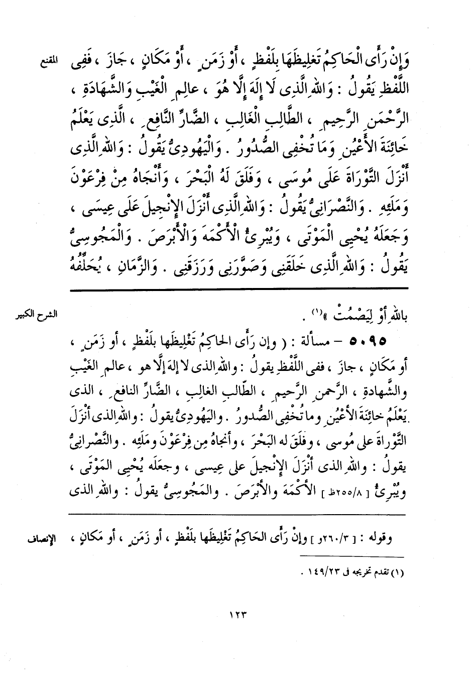 وَإِنْ رَأَى الْحَاكِمُ تَغلِيظَهَا بِلَفْظٍ، أَوْ زَمَنٍ، أَوْ مَكَانٍ، جَازَ، فَفِى اللَّفْظِ يَقُولُ: وَاللَّهِ الَّذِى لَا إِلَهَ إِلَّا هُوَ، عالِمِ الْغَيْبِ وَالشَّهَادَةِ، الرَّحْمَنِ الرَّحِيمِ، الطَّالِبِ الْغَالِبِ، الضَّارِّ النَّافِعِ، الَّذِى يَعْلَمُ خَائِنَةَ الأعْيُنِ وَمَا تُخْفِى الصُّدُورُ. وَالْيَهُودِىُّ يَقُولُ: وَاللَّهِ الَّذِى أَنْزَلَ التَّوْرَاةَ عَلَى مُوسَى، وَفَلَقَ لَهُ الْبَحْرَ، وَأَنْجَاهُ مِنْ فِرْعَوْنَ وَمَلَئِهِ. وَالنَّصْرَانِىُّ يَقُولُ: وَاللَّهِ الَّذِى أَنْزَلَ الإِنْجِيلَ عَلَى عِيسَى، وَجَعَلَهُ يُحْيِى الْمَوْتَى، وَيُبْرِئُ الأَكْمَهَ وَالْأَبْرَصَ. وَالْمَجُوسِىُّ يَقُولُ: وَاللَّهِ الَّذِى خَلَقَنِى وَصَوَّرَنِى وَرَزَقَنِى. وَالزَّمَانِ، يُحَلِّفُهُ