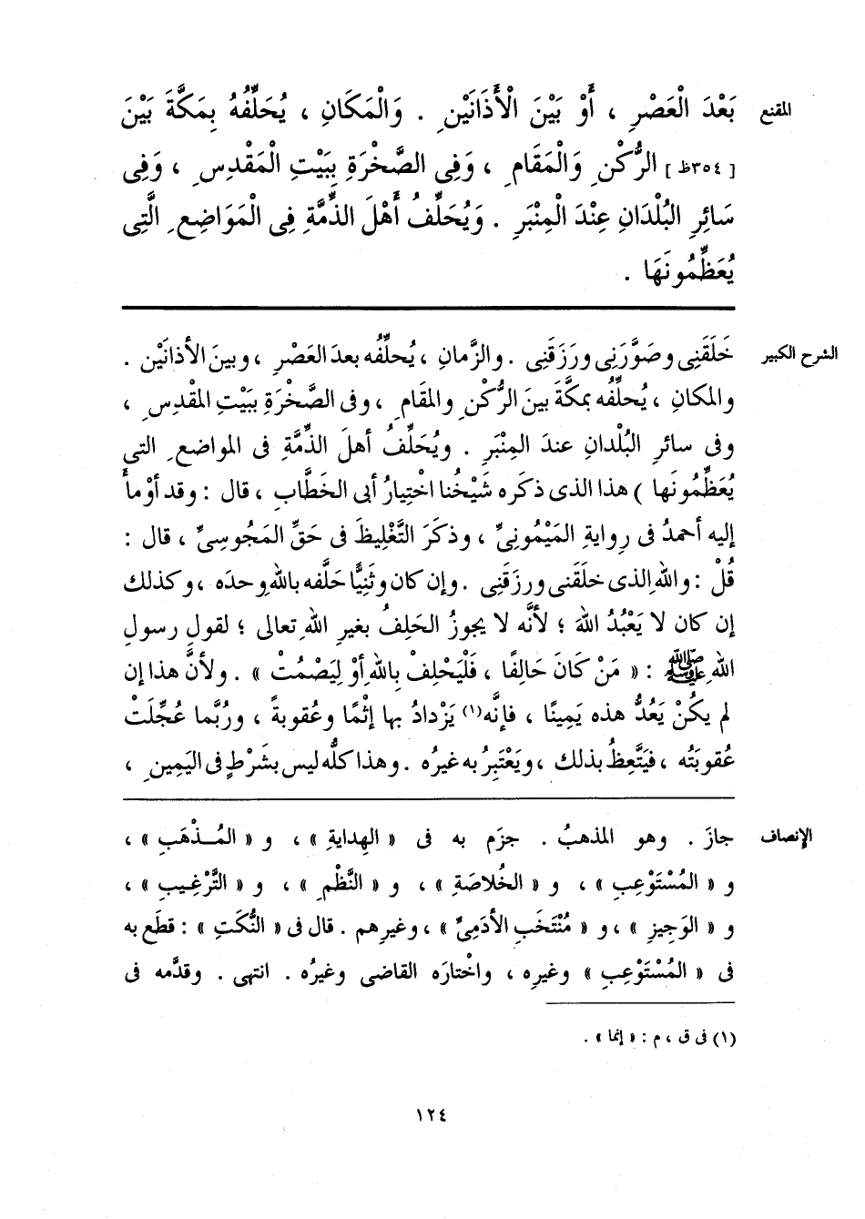 بَعْدَ الْعَصْرِ، أَوْ بَيْنَ الْأَذَانَيْنِ. وَالْمَكَانِ، يُحَلِّفُهُ بِمَكَّةَ بَيْنَ الرُّكْنِ وَالْمَقَامِ، وَفِى الصَّخْرَةِ بِبَيْتِ الْمَقْدِسِ، وَفِى سَائِرِ البُلْدَانِ عِنْدَ الْمِنْبَرِ. وَيُحَلِّفُ أَهْلَ الذِّمَّةِ فِى الْمَوَاضِعِ الَّتِى يُعَظِّمُونَهَا.