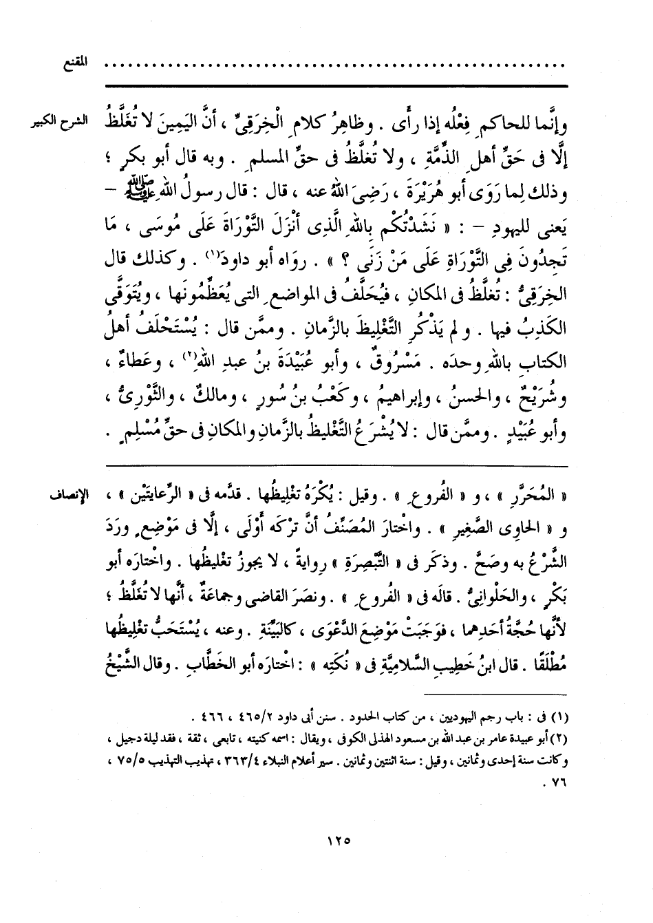 «المُحَرَّرِ»، و «الفُروعِ». وقيل: يُكْرَهُ تغْلِيظُها. قدَّمه فى «الرِّعايتَيْن»، و «الحاوِى الصَّغِيرِ». واخْتارَ المُصَنِّفُ أنَّ ترْكَه أَوْلَى، إلَّا فى مَوْضِعٍ ورَدَ الشَّرْعُ به وصَحَّ. وذكَر فى «التَّبْصِرَةِ» رِوايةً، لا يجوزُ تغْليظُها. واخْتارَه أبو بَكْرٍ، والحَلْوانِىُّ. قالَه فى «الفُروعِ». ونصَرَ القاضى وجماعَةٌ، أنَّها لا تُغَلَّظُ؛ لأنَّها حُجَّةُ أحَدِهما، فوَجَبَتْ مَوْضِعَ الدَّعْوَى، كالبَيِّنَةِ. وعنه، يُسْتَحَبُّ تغْلِيظُها مُطْلَقًا. قال ابنُ خَطِيبِ السَّلامِيِّةِ فى «نُكَتِه»: اخْتارَه أبو الخَطَّابِ. وقال الشَّيْخُ