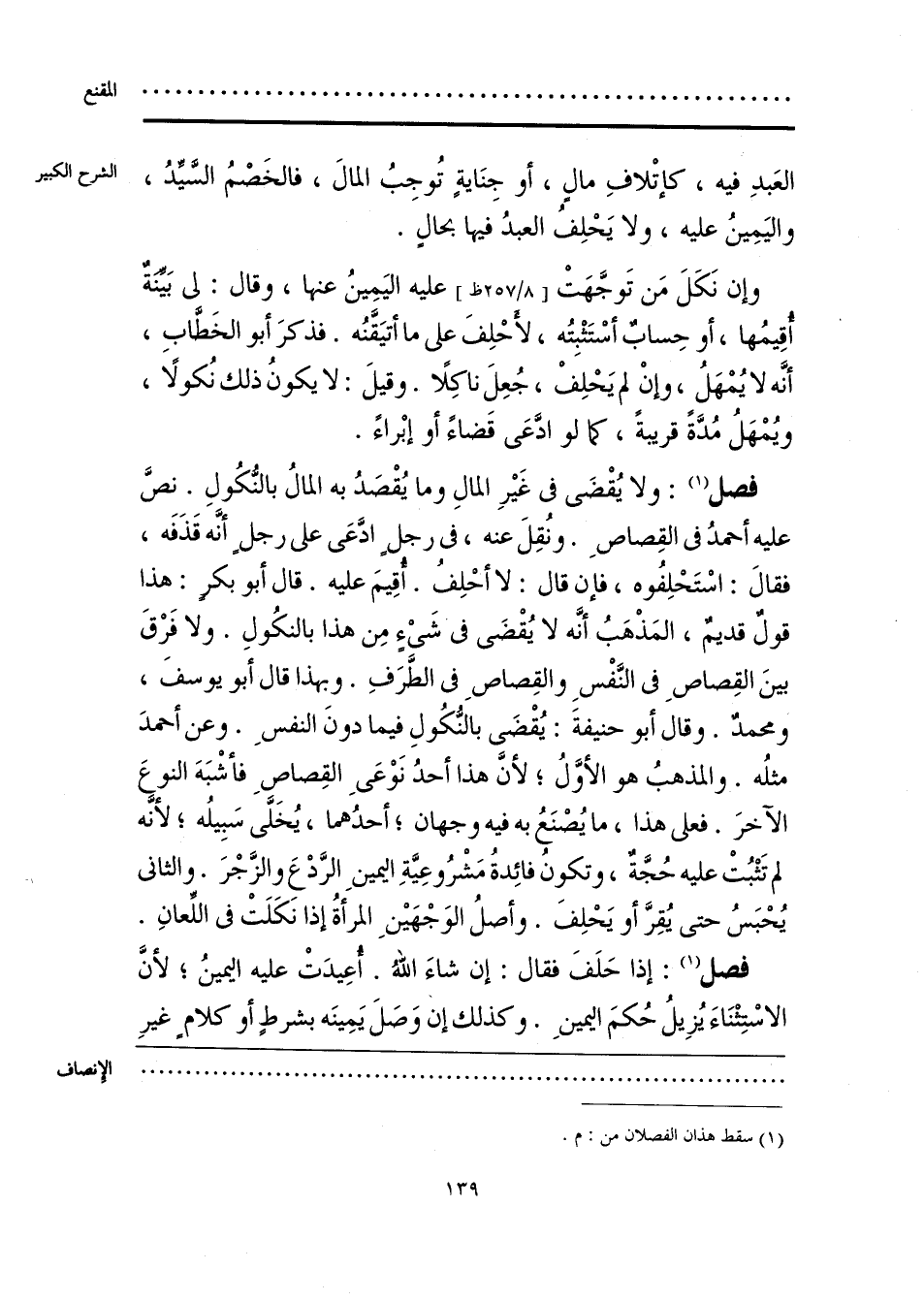 فصل (1): ولا يُقْضَى في غَيْرِ المالِ وما يُقْصَدُ به المالُ بالنُّكُولِ. نصَّ عليه أحمدُ في القِصاصِ. ونُقِلَ عنه، في رجل ادَّعَى على رجلٍ أنَّه قَذَفَه، فقالَ: اسْتَحْلِفُوه، فإن قال: لا أحْلِفُ. أقِيمَ عليه. قال أبو بكرٍ: هذا قولٌ قديمٌ، المَذْهبُ أنَّه لا يُقْضَى في شَىْءٍ مِن هذا بالنكُولِ. ولا فَرقَ بينَ القِصاصِ في النَّفْسِ والقِصاصِ في الطَّرَفِ. وبهذا قال أبو يوسفَ، ومحمدٌ. وقال أبو حنيفةَ: يُقْضَى بالنُّكُولِ فيما دونَ النفسِ. وعن أحمدَ مثلُه. والمذهبُ هو الأَوَّلُ؛ لأَنَّ هذا أحدُ نَوْعَىِ القِصاصِ فأَشْبَهَ النوعِ الآخرَ. فعلى هذا، ما يُصنَعُ به فيه وجهان؛ أحدُهما، يُخَلَّى سَبِيلُه؛ لأنَّه لم تَثْبُتْ عليه حُجَّة، وتكونُ فائِدةُ مَشْرُوعِيَّةِ أنْينِ الرَّدْعَ والزَّجْرَ. والثانى يُحْبَسُ حتى يُقِرَّ أو يَحْلِفَ. وأصلُ الوَجْهيْنِ المرأةُ إذا نَكَلَتْ في اللِّعانِ.