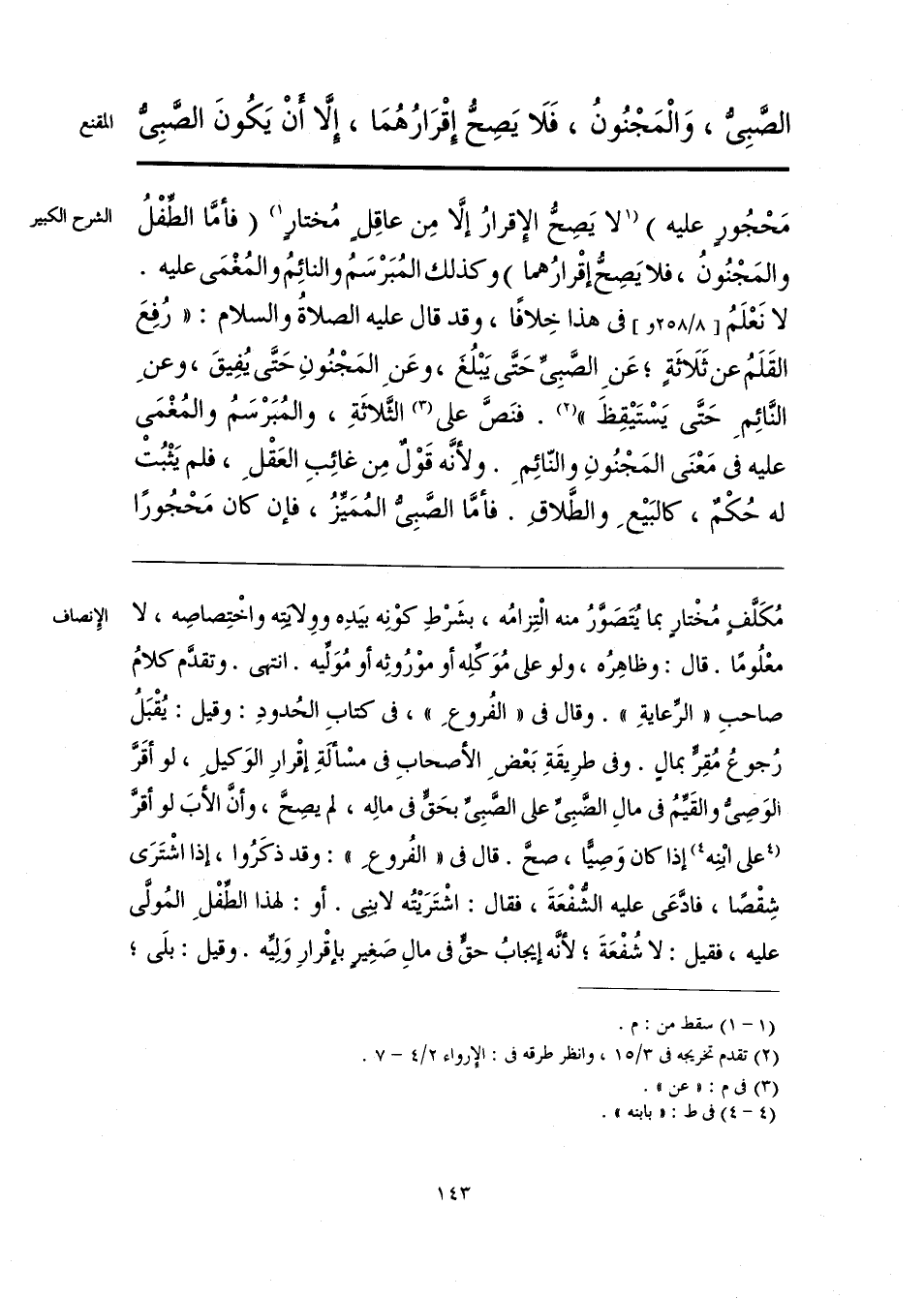 الصَّبِىُّ، وَالْمَجْنُونُ، فَلَا يَصِحُّ إقْرَارُهُمَا، إِلَّا أَنْ يَكُونَ الصَّبِىُّ