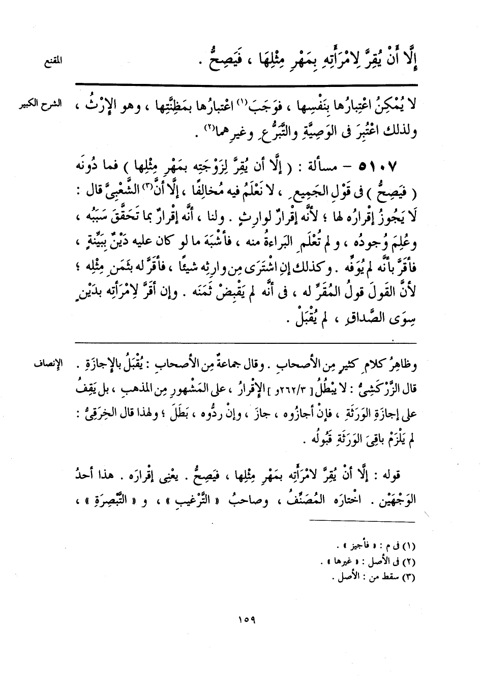 قوله: إلَّا أَنْ يُقِرَّ لامْرَأَتِه بمَهْرِ مِثْلِها، فيَصِحُّ. يعْنِى إقْرارَه. هذا أحدُ الوَجْهيْن. اخْتارَه المُصَنِّفُ، وصاحبُ «التَّرْغيبِ»، و «التَّبْصِرَة»،