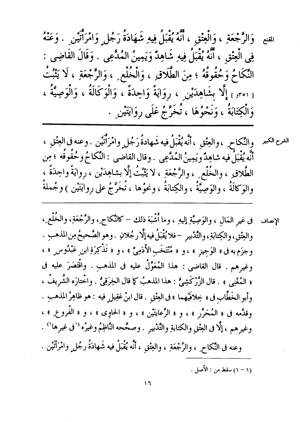 فى غيرِ المَالِ، والوصِيَّةِ إليهِ، وما أشْبَهَ ذلك - كالنِّكاحِ، والرَّجْعَةِ، والخُلْعِ، والعِتْقِ، والكِتابَةِ، والتَّدْبيرِ - فلا يُقْبَلُ فيه إلَّا رجلانِ. وهو الصحيحُ مِن المذهبِ. وجزَم به فى «الوَجِيزِ»، و «مُنْتَخَبِ الأدَمِىِّ»، و «تَذْكِرَةِ ابنِ عَبْدُوس»، وغيرِهم. قال القاضى: هذا المُعَوَّلُ عليه فى المذهبِ. واقْتَصَرَ عليه فى «المُغْنِى». قال الزَّرْكَشِىُّ: هذا المذهبُ؛ قال الخِرَقِىُّ. واخْتارَه الشَّرِيفُ، وأبو الخَطَّابِ فى «خِلافَيْهما» فى العِتْقِ. قال ابنُ عَقِيل فيه: هو ظاهِرُ المذهبِ. وقدَّمه فى «المُحَرَّرِ»، و «الرِّعايتَيْن»، و «الحاوِى»، و «الفُروعِ»، وغيرِهم، إلَّا فى العِتْقِ والكتابةِ والتَّدْبيرِ. وصحَّحه النَّاظِمُ وغيرُه [فى غيرِها] (¬1).