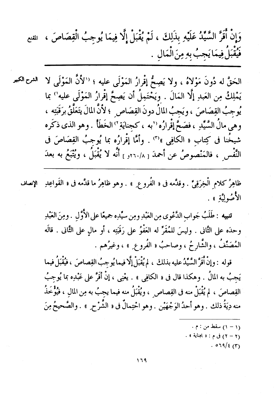 تنبيه: طَلَبُ جَوابِ الدَّعْوى مِن العَبْدِ ومِن سيِّدِه جميعًا على الأوَّلِ. ومِنَ العَبْدِ وحدَه على الثَّانى. وليسَ للمُقَرِّ له العَفْوُ على رَقَبَتِه، أو مالٍ على الثَّانى. قالَه المُصَنِّفُ، والشَّارِحُ، وصاحبُ «الفُروعِ»، وغيرُهم.