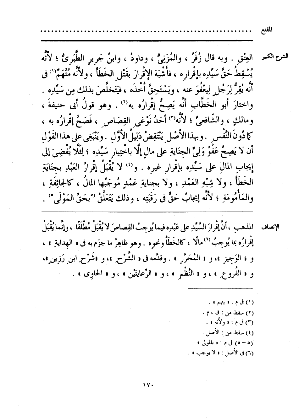 المذهبِ، أنَّ إقْرارَ السَّيِّدِ على عَبْدِه فيما يُوجِبُ القِصاصَ لا يُقْبَلُ مُطْلَقًا، وإنَّما يُقْبَلُ إقْرارُه بما يُوجِبُ (¬1) مالًا، كالخَطَأَ ونحوِه. وهو ظاهِرُ ما جزَم به فى «الهِدايَةِ»، و «الوَجِيزِ»، و «المُحَرَّرِ». وقدَّمه فى «الشَّرْحِ»، و «شَرْحِ ابنِ رَزِينٍ»، و «الفُروعِ»، و «النَّظْمِ»، و «الرِّعايَتَيْن»، و «الحاوِى».