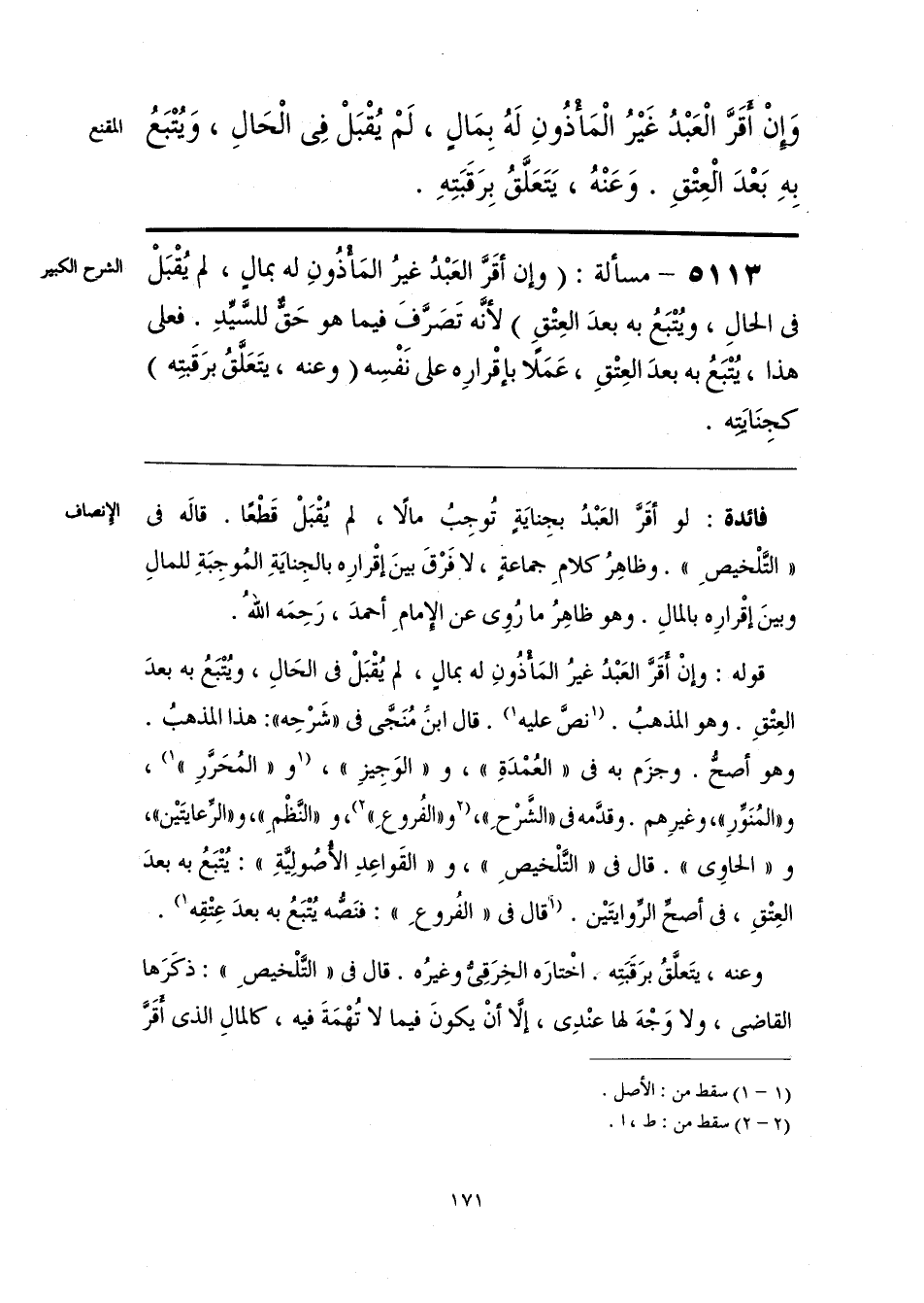 قوله: وإنْ أَقَرَّ العَبْدُ غيرُ المَأْذُونِ له بمالٍ، لم يُقْبَلْ فى الحَالِ، ويُتْبَعُ به بعدَ العِتْقِ. وهو المذهبُ. [نصَّ عليه] (¬1). قال ابن مُنَجَّى فى «شَرْحِه»: هذا المذهبُ. وهو أصحُّ. وجزَم به فى «العُمْدَةِ»، و «الوَجِيزِ»، [و «المُحَرَّرِ»] (1)، و «المُنَوِّر»، وغيرِهم. وقدَّمه فى «الشَّرْحِ»، [و «الفُروعِ»] (¬2)، و «النَّظْمِ»، و «الرِّعايتَيْن»، و «الحاوِى». قال فى «التَّلْخيصِ»، و «القَواعِدِ الأُصُولِيَّةِ»: يُتْبَعُ به بعدَ العِتْقِ، فى أصح الرِّوايتَيْن. [قال فى «الفُروعِ»: فنَصُّه يُتْبَعُ به بعدَ عِتْقِه] (1).