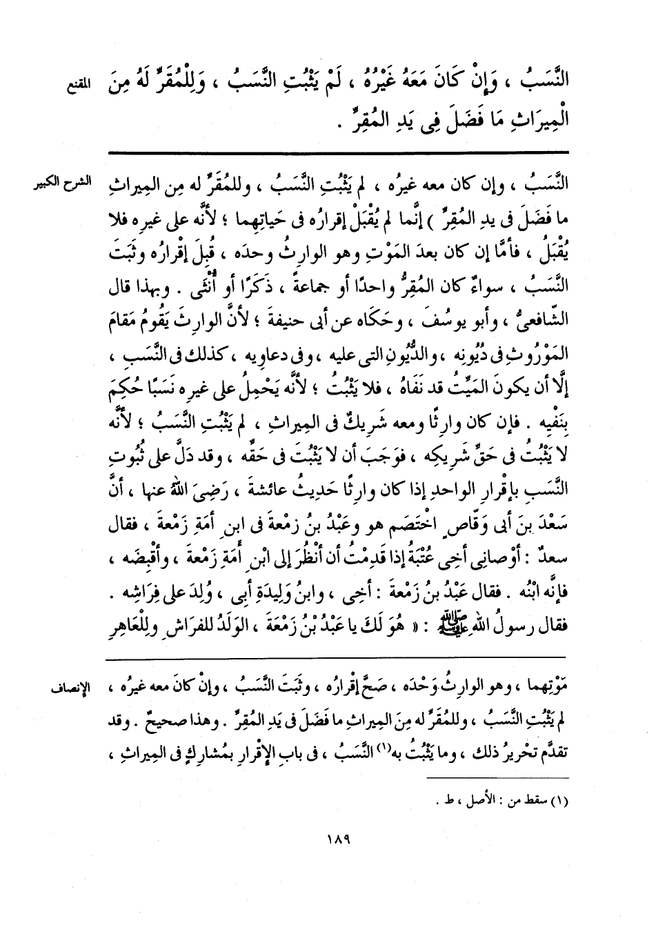 النَّسَبُ، وَإِنْ كَانَ مَعَهُ غَيْرُهُ، لَمْ يَثْبُتِ النَّسَبُ، وَلِلْمُقَرِّ لَهُ مِنَ الْمِيرَاثِ مَا فَضَلَ فِى يَدِ المُقِرِّ.