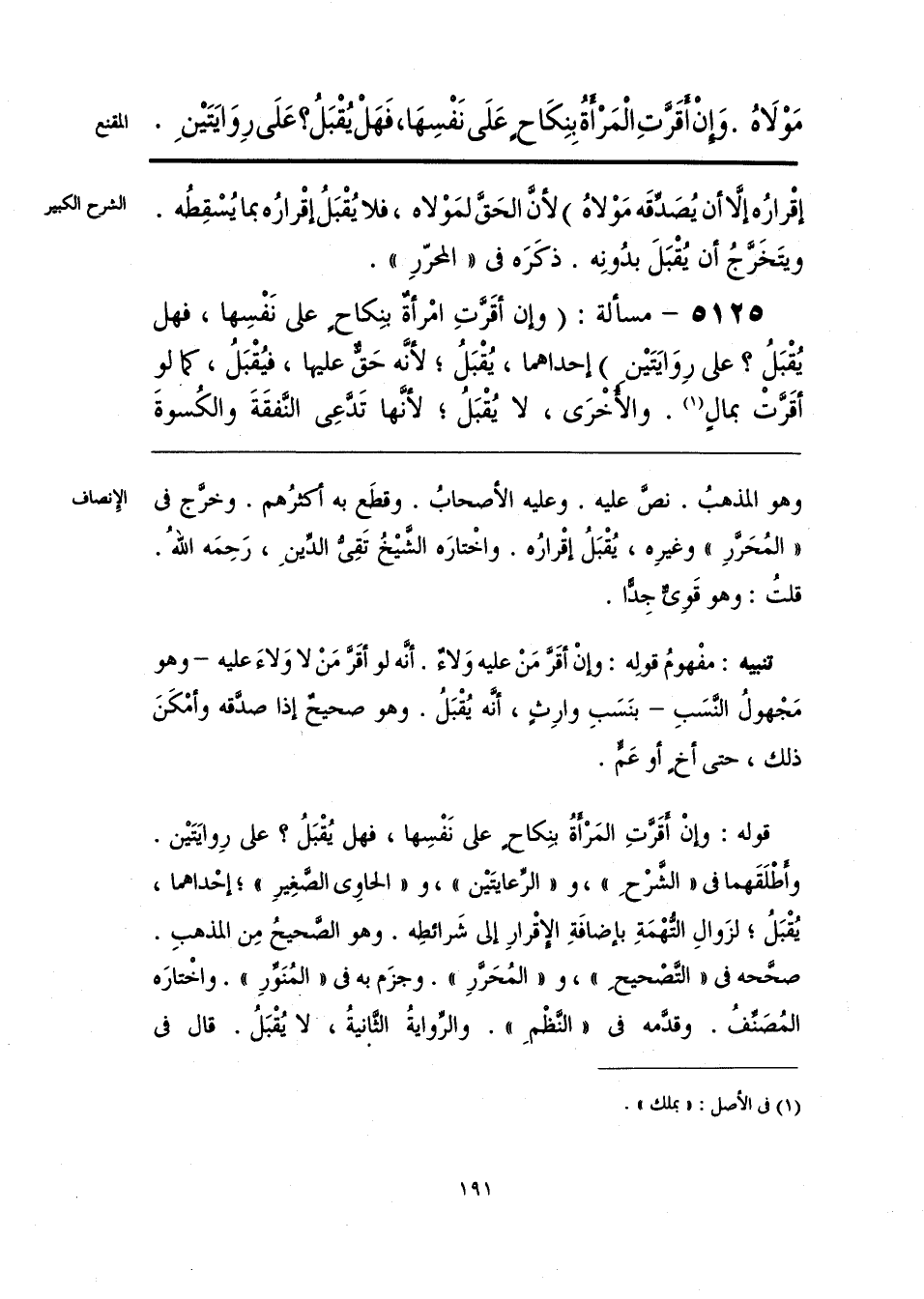 قوله: وإنْ أَقَرَّتِ المَرْأَةُ بنِكاحٍ على نَفْسِها، فهل يُقْبَلُ؟ على رِوايَتَيْن. وأَطْلَقَهما فى «الشَّرْحِ»، و «الرِّعايتَيْن»، و «الحاوِى الصَّغِيرِ»؛ إحْداهما، يُقْبَلُ؛ لزَوالِ التُّهْمَةِ بإضافَةِ الإِقْرارِ إلى شَرائطِه. وهو الصَّحيحُ مِن المذهبِ. صحَّحه فى «التَّصْحيحِ»، و «المُحَرَّرِ». وجزَم به فى «المُنَوِّرِ». واخْتارَه المُصَنِّفُ. وقدَّمه فى «النَّظْمِ». والرِّوايةُ الثَّانيةُ، لا يُقْبَلُ. قال فى