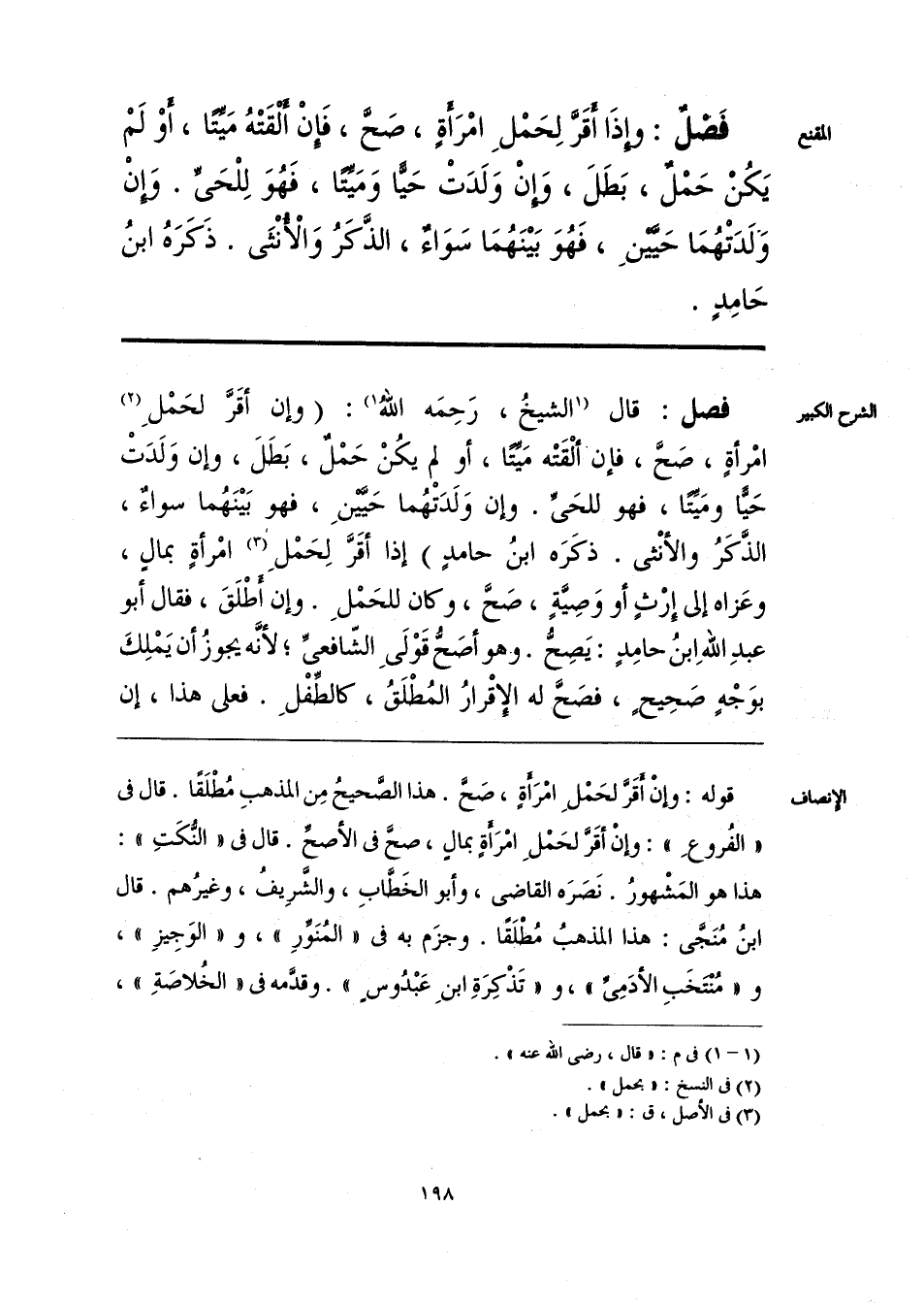 قوله: وإنْ أقرَّ لحَمْلِ امْرَأَةٍ، صَحَّ. هذا الصَّحيحُ مِن المذهبِ مُطْلَقًا. قال فى «الفُروعِ»: وإنْ أقَرَّ لحَملِ امْرَأةٍ بمالٍ، صحَّ فى الأصحِّ. قال فى «النُّكَتِ»: هذا هو المَشْهورُ. نَصَرَه القاضى، وأبو الخَطَّابِ، والشَّريفُ، وغيرُهم. قال ابنُ مُنَجَّى: هذا المذهبُ مُطْلَقًا. وجزَم به فى «المُنَوِّرِ»، و «الوَجِيزِ»، و «مُنْتَخَبِ الأدَمِىِّ»، و «تَذْكِرَةِ ابنِ عَبْدُوسٍ». وقدَّمه فى «الخُلاصَةِ»،
