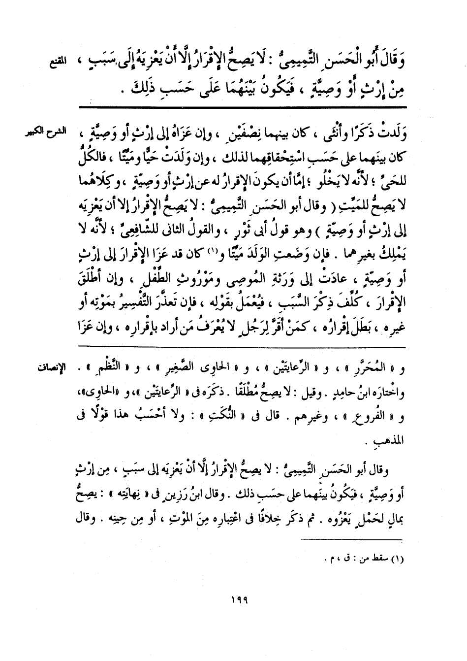 وقال أبو الحَسَنِ التَّمِيمِىُّ: لا يصِحُّ الإِقرارُ إلَّا أَنْ يَعْزِيَه إلى سبَبٍ، مِن إرْثٍ أو وَصِيَّةٍ، فيَكُونُ بينَهما على حسَبِ ذلك. وقال ابنُ رَزِينٍ فى «نِهايَتِه»: يصِحُّ بمالٍ لحَمْلٍ يَعْزُوه. ثم ذكَر خِلافًا فى اعْتِبارِه مِنَ الموْتِ، أو مِن حِينِه. وقال
