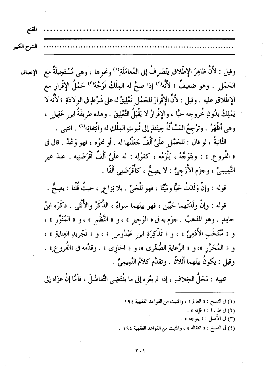 وقيل: لأنَّ ظاهِرَ الإِطْلاقِ ينْصَرِفُ إلى المُعامَلَةِ (¬1) ونحوِها، وهى مُسْتَحِيلَةٌ مع الحَمْلِ. وهو ضعيفٌ؛ لأنَّه (¬2) إذا صحَّ له المِلْكُ تَوَجَّهَ (¬3) حَمْلُ الإِقْرارِ مع الإِطْلاق عليه. وقيل: لأَنَّ الإِقْرارَ للحَمل تَعْلِيق له على شَرْطٍ فى الوِلادَةِ؛ لأنَّه لا يَمْلِكُ بدُونِ خُروجِه حيًّا، والإقْرارُ لا يَقْبَلُ التَّعْلِيقَ. وهذه طرِيقَةُ ابنِ عَقِيلٍ، وهى أظْهَرُ. وترْجِعُ المَسْأَلةُ حِينَئذٍ إلى ثُبوتِ المِلْك له وانْتِفائِه (¬4). انتهى.