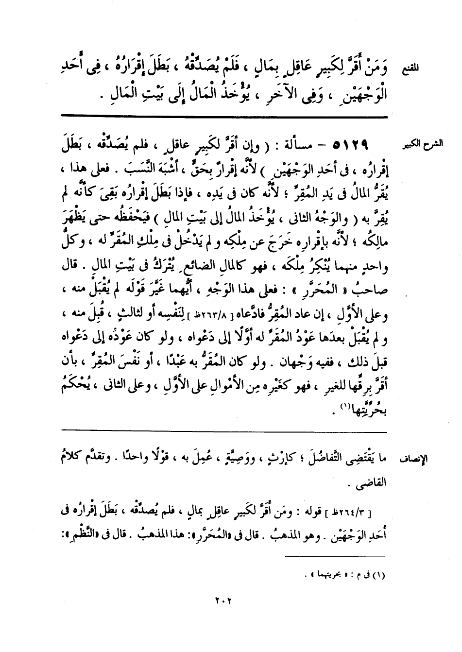 وَمَنْ أَقَرَّ لِكَبِيرٍ عَاقِلٍ بِمَالٍ، فَلَمْ يُصَدِّقْهُ، بَطَلَ إقْرَارُهُ، فِى أَحَدِ الْوَجْهَيْنِ، وَفِى الآخَرِ، يُؤْخَذُ الْمَالُ إلى بَيْتِ الْمَالِ.