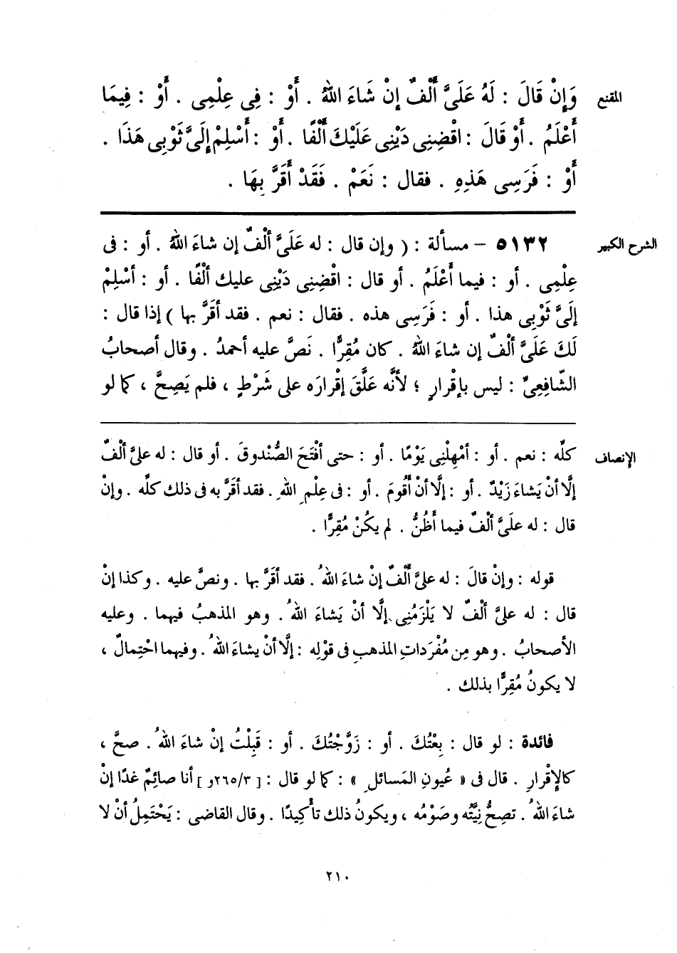 وَإِنْ قَالَ: لَهُ عَلَىَّ أَلْفٌ إنْ شَاءَ اللَّهُ. أو: فِى عِلْمِى. أَوْ: فِيمَا أَعْلَمُ. أَوْ قَالَ: اقْضِنِى دَيْنِى عَلَيْكَ ألفًا. أَوْ: أَسْلِمْ إِلَىَّ ثَوْبِى هَذَا. أَوْ: فَرَسِى هَذِهِ. فقال: نَعَمْ. فَقَدْ أَقَرَّ بِهَا.