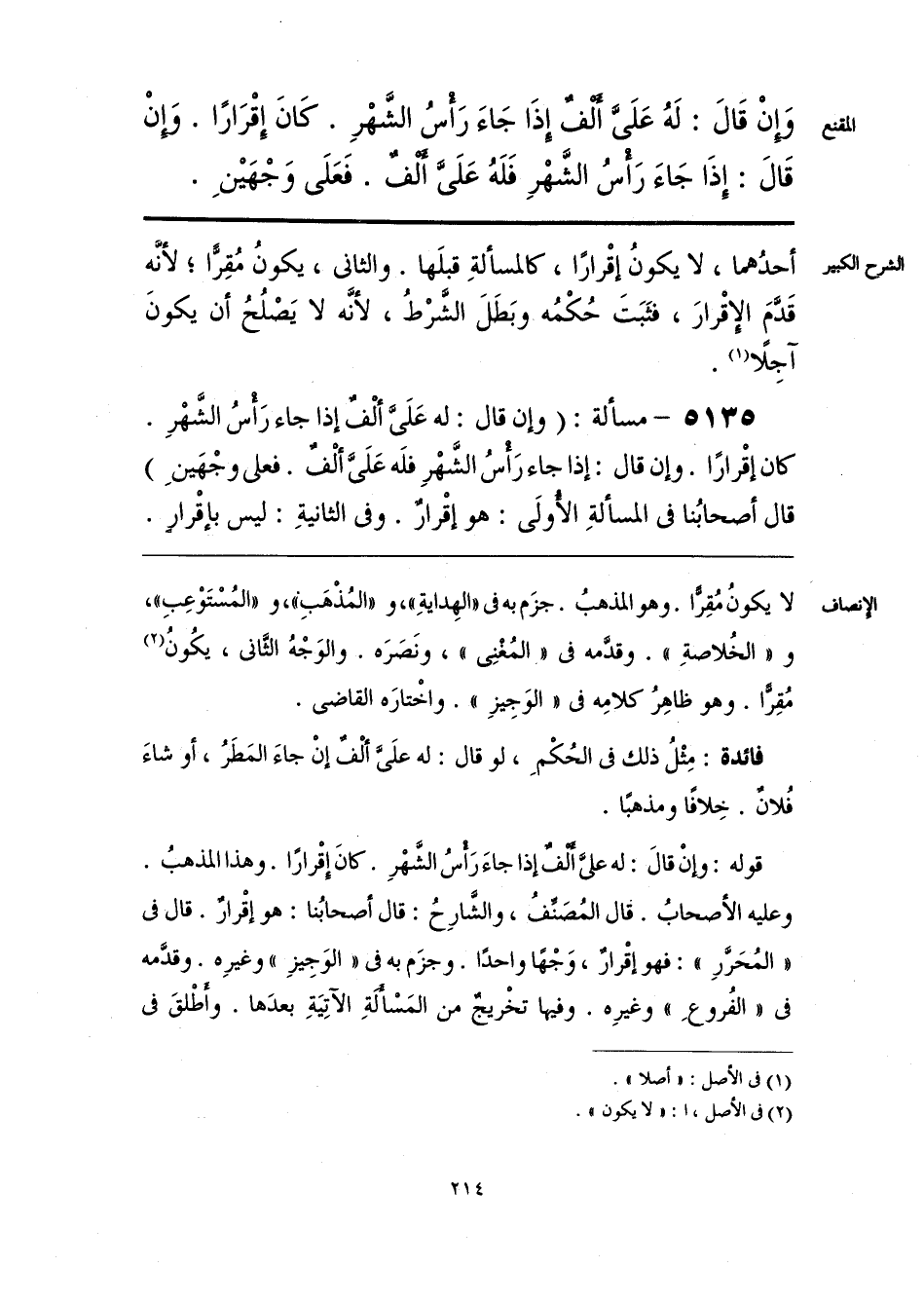 قوله: وإنْ قالَ: له علىَّ أَلْفٌ إذا جاءَ رَأسُ الشَّهْرِ. كانَ إقْرارًا. وهذا المذهبُ. وعليه الأصحابُ. فال المُصَنِّفُ، والشَّارِحُ: قال أصحابُنا: هو إقْرارٌ. قال فى «المُحَرَّرِ»: فهو إقْرار، وَجْهًا واحدًا. وجزَم به فى «الوَجِيزِ» وغيرِه. وقدَّمه فى «الفُروعِ» وغيرِه. وفيها تخْريجٌ من المَسْأَلَةِ الآتِيَةِ بعدَها. وأَطْلقَ فى