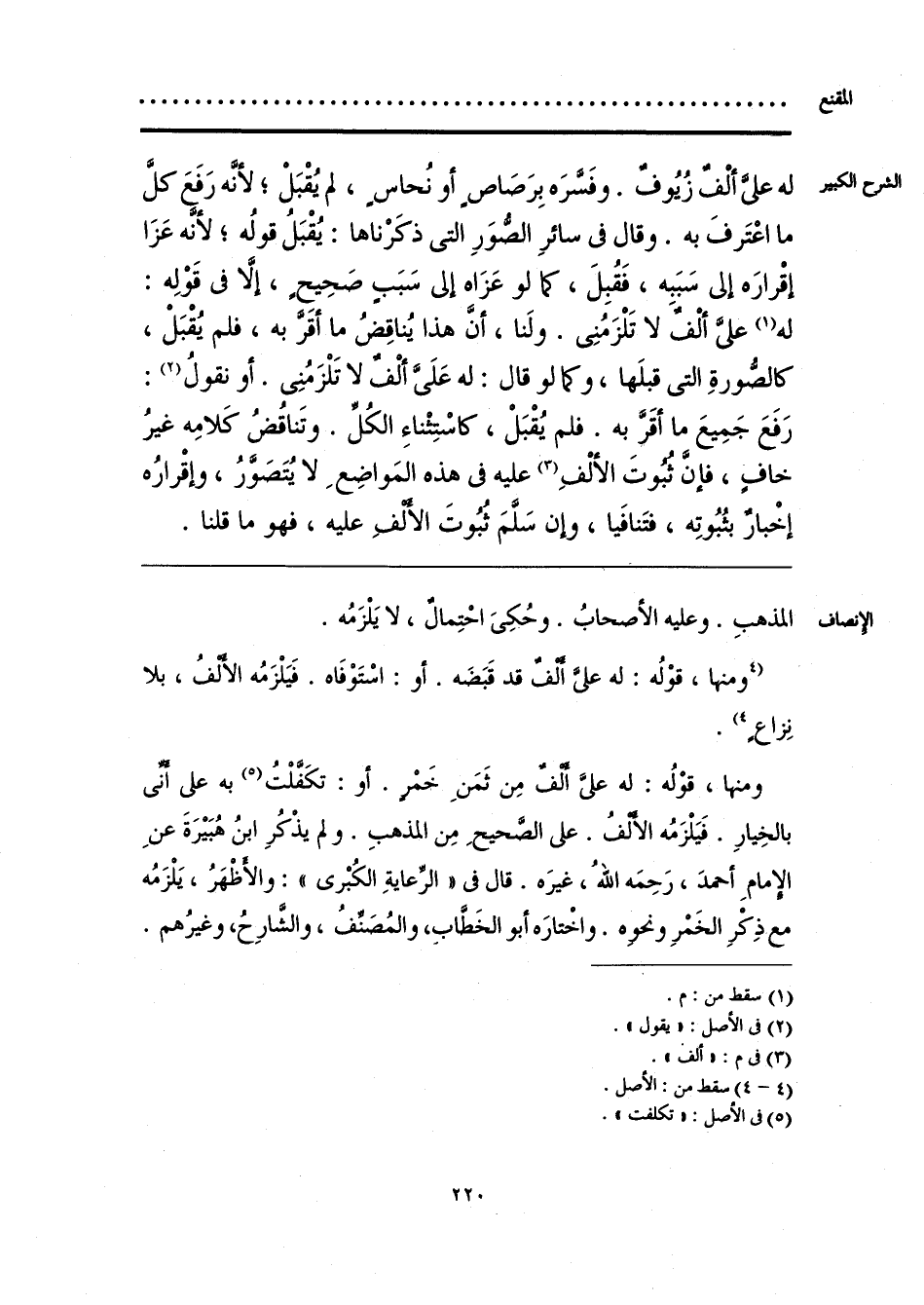 ومنها، قوْلُه: له على أَلْفٌ مِن ثَمَنِ خَمْرٍ. أو: تكَفَّلْتُ (¬2) به على أَنِّى بالخِيارِ. فَيَلْزَمُه الأَلْفُ. على الصَّحيحِ مِن المذهبِ. ولم يذْكُرِ ابنُ هُبَيْرَةَ عنِ الإِمامِ أحمدَ، رَحِمَه اللَّهُ، غيرَه. قال فى «الرِّعايَةِ الكُبْرى»: والأَظْهَرُ، يَلْزَمُه مع ذِكْرِ الخَمْرِ ونحوه. واخْتارَه أبو الخَطَّابِ، والمُصَنِّفُ، والشَّارِحُ، وغيرُهم.