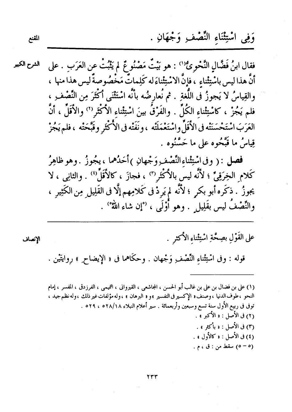 قوله: وفى اسْتِثْناءِ النِّصْفِ وَجْهان. وحكَاهما فى «الإِيضاحِ» رِوايتَيْن.