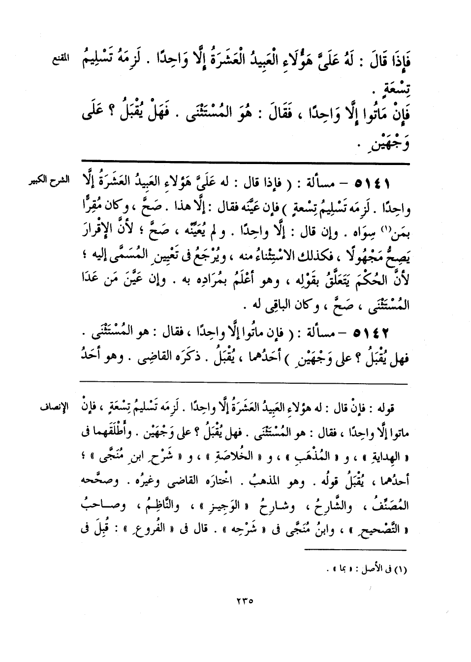 قوله: فإنْ قال: له هؤلاءِ العَبِيدُ العَشَرَةُ إلَّا واحِدًا. لَزِمَه تَسْليمُ تِسْعَةٍ، فإنْ ماتوا إلَّا واحِدًا، فقال: هو المُسْتَثْنَى. فهل يُقْبَلُ؟ على وَجْهَيْن. وأَطْلَقَهما فى «الهِدايَةِ»، و «المُذْهَبِ»، و «الخُلاصَةِ»، و «شَرْحِ ابنِ مُنَجَّى»؛ أحدُهما، يُقْبَلُ قولُه. وهو المذهبُ. اخْتارَه القاضى وغيرُه. وصحَّحه المُصَنِّفُ، والشَّارِحُ، وشارِحُ «الوَجِيزِ»، والنَّاظِمُ، وصاحبُ «التَّصْحيحِ»، وابنُ مُنَجَّى فى «شَرْحِه». قال فى «الفُروعِ»: قُبِلَ فى