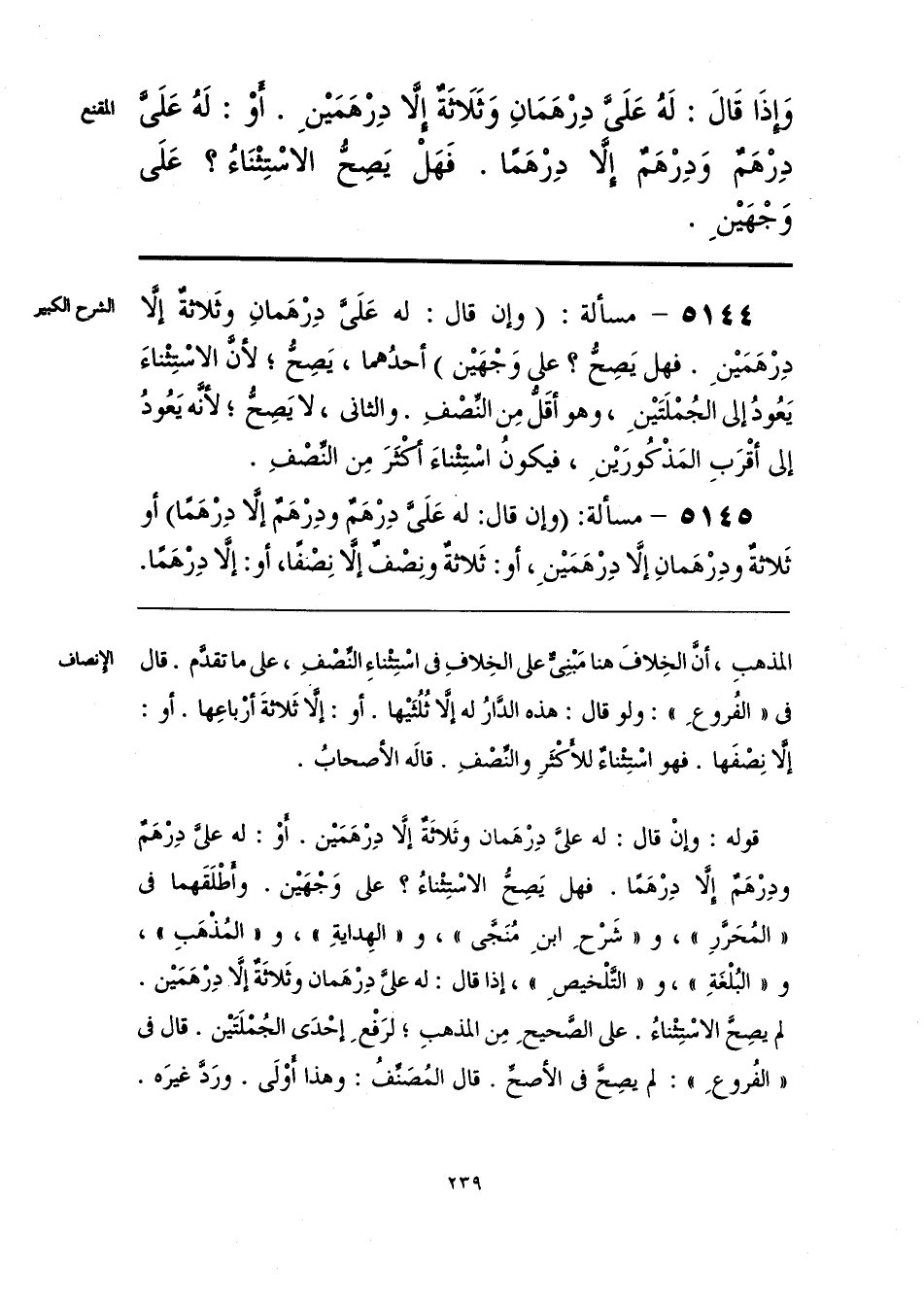 قوله: وإنْ قال: له علىَّ دِرْهَمان وثَلَاثةٌ إلَّا درْهَمَيْن. أَوْ: له علىَّ دِرْهَمٌ ودِرْهَمٌ إلَّا دِرْهَمًا. فهل يَصِحُّ الاسْتِثْناءُ؟ عَلى وَجْهَيْن. وأَطْلَقَهما فى «المُحَرَّرِ»، و «شَرْحِ ابنِ مُنَجَّى»، و «الهِدايَةِ»، و «المُذْهَبِ»، و «البُلْغَةِ»، و «التَّلْخيصِ»، إذا قال: له علىَّ دِرْهَمان وثَلَاثةٌ إلَّا دِرْهَمَيْن. لم يصِحَّ الاسْتِثْناءُ. على الصَّحيحِ مِن المذهبِ؛ لرَفْعِ إحْدَى الجُمْلَتَيْن. قال فى «الفُروعِ»: لم يصِحَّ فى الأصحِّ. قال المُصَنِّفُ: وهذا أَوْلَى. ورَدَّ غيرَه.