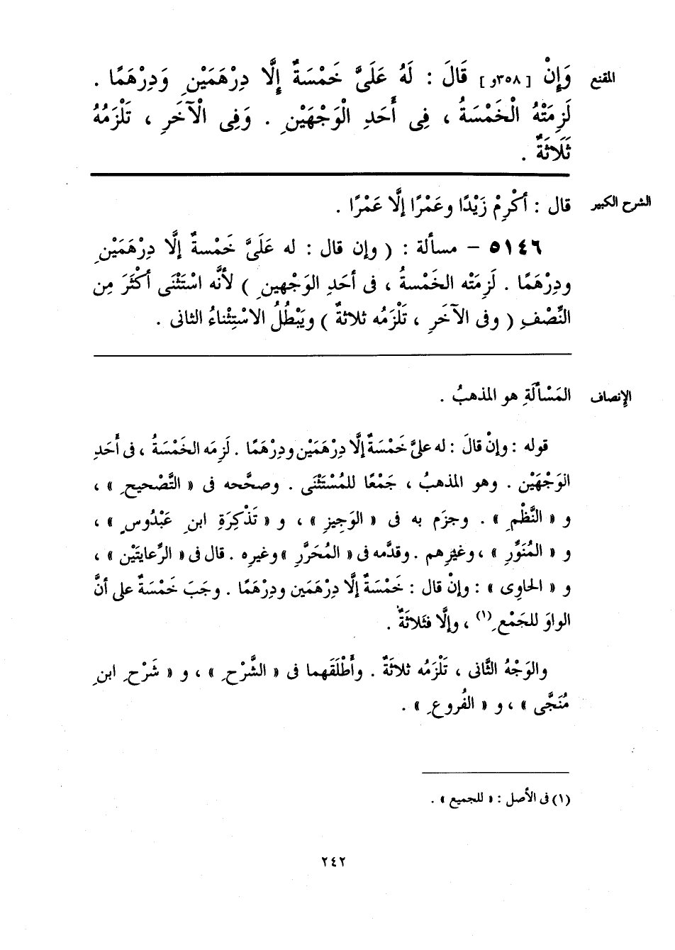 قوله: وإنْ قال: له علىَّ خَمْسَةٌ إلَّا دِرْهَمَيْن ودِرْهَمًا. لَزِمَه الخَمْسَةُ، فى أحَدِ الوَجْهَيْن. وهو المذهبُ، جَمْعًا للمُسْتَثْنَى. وصحَّحه فى «التَّصْحيحِ»، و «النَّظْمِ». وجزَم به فى «الوَجِيزِ»، و «تَذْكِرَةِ ابنِ عَبْدُوسٍ»، و «المُنَوِّرِ»، وغيْرِهم. وقدَّمه فى «المُحَرَّرِ» وغيرِه. قال فى «الرِّعايتَيْن»، و «الحاوِى»: وإنْ قال: خَمْسَةٌ إلَّا دِرْهَمَين ودِرْهَمًا. وجَبَ خَمْسَةٌ على أنَّ الوإوَ للجَمْعِ (¬1)، وإلَّا فثَلَاثةٌ.