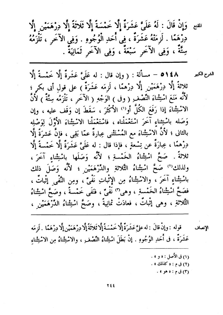 قوله: وإنْ قالَ: له علىَّ عَشَرَةٌ إلَّا خَمْسَةً إلَّا ثَلَاثَةً إلَّا دِرْهَمَيْن إلَّا دِرْهَمًا. لَزِمَه عَشَرَةٌ، فى أَحَدِ الوُجُوهِ. إنْ بَطَلَ اسْتِثْناءُ النِّصْفِ، والاسْتِثْناءُ مِن الاسْتِثْناءِ