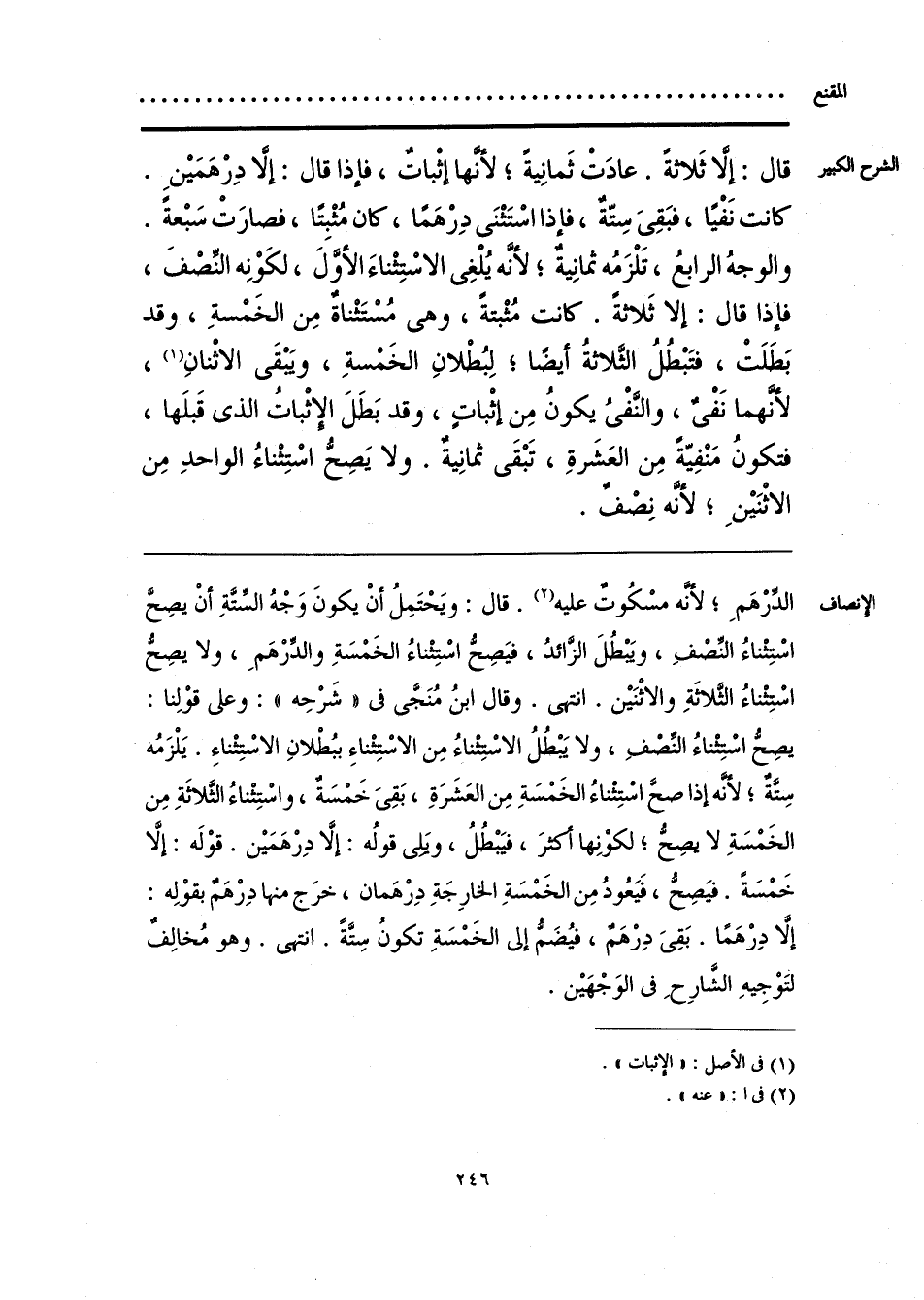 الدِّرْهَمِ؛ لأنَّه مسْكُوتٌ عليه (¬1). قال: ويَحْتَمِلُ أَنْ يكونَ وَجْهُ السِّتَّةِ أَنْ يصِحَّ اسْتِثْناءُ النِّصْفِ، ويَبْطُلَ الزَّائدُ، فيَصِحُّ اسْتِثْناءُ الخَمْسَةِ والدِّرْهَمِ، ولا يصِحُّ اسْتِثْناءُ الثَّلاثَةِ والاثْنَيْن. انتهى. وقال ابنُ مُنَجَّى فى «شَرْحِه»: وعلى قوْلِنا: يصِحُّ اسْتِثْناءُ النِّصْفِ، ولا يَبْطُلُ الاسْتِثْناءُ مِن الاسْتِثْناءِ ببُطْلانِ الاسْتِثْناءِ. يَلْزَمُه سِتَّةٌ؛ لأنَّه إذا صحَّ اسْتِثْناءُ الخَمْسَةِ مِن العَشَرَةِ، بَقِىَ خَمْسَةٌ، واسْتِثْناءُ الثَّلاثَةِ مِن الخَمْسَةِ لا يصِحُّ؛ لكوْنِها أكثرَ، فيَبْطُلُ، ويَلِى قولُه: إلَّا دِرْهَمَيْن. قوْلَه: إلَّا خَمْسَةً. فيَصِحُّ، فَيَعُودُ مِن الخَمْسَةِ الخارِجَةِ دِرْهَمان، خرَج منها دِرْهَمٌ بقوْلِه: إلَّا دِرْهَمًا. بَقِىَ دِرْهَمٌ، فيُضَمُّ إلى الخَمْسَةِ تكونُ سِتَّةً. انتهى. وهو مُخالِفٌ لتوْجِيهِ الشَّارِحِ فى الوَجْهَيْن.
