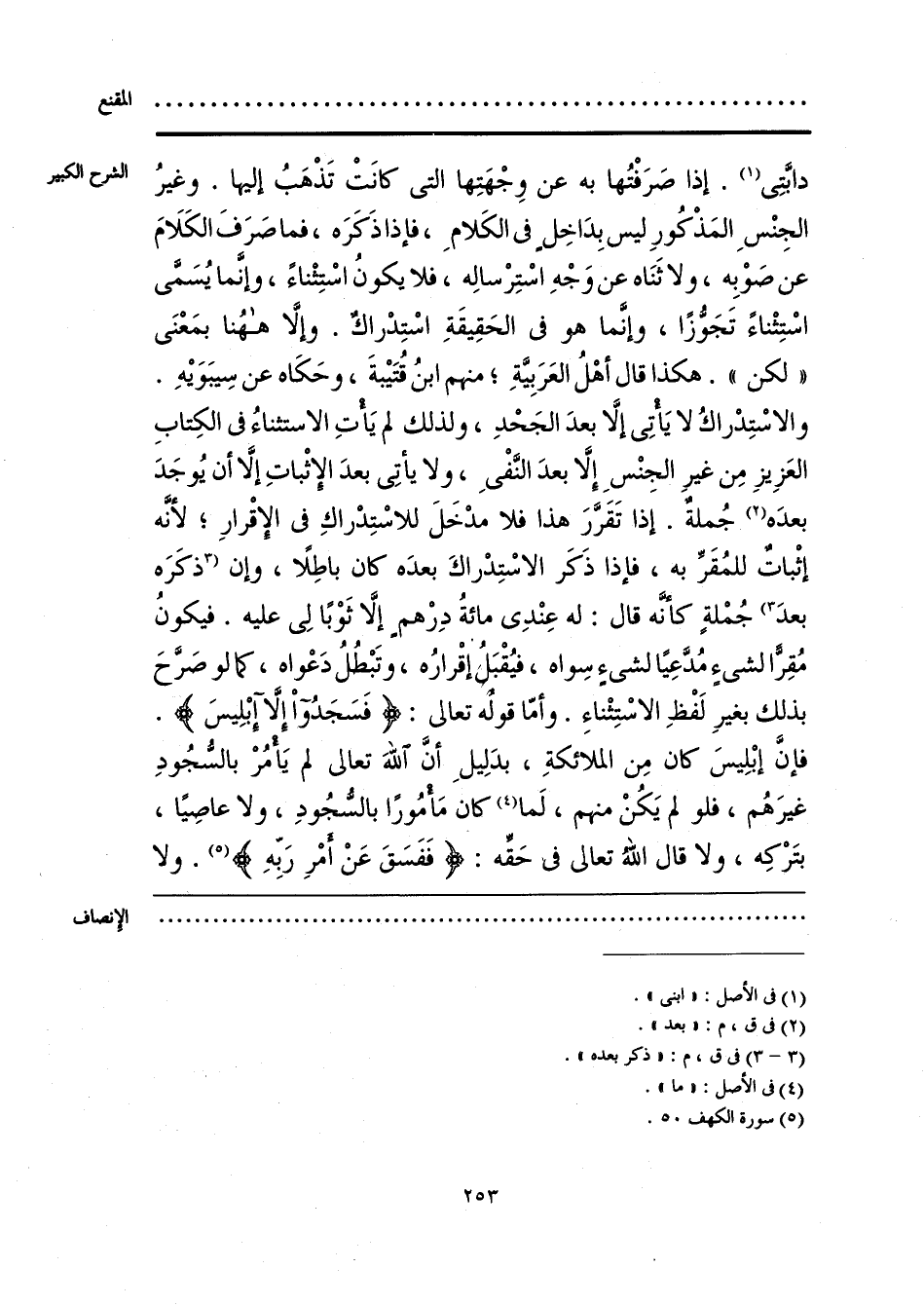 دابَّتِى (¬1). إذا صَرَفْتُها به عن وِجْهَتِها التى كانَتْ تَذْهَبُ إليها. وغيرُ الجِنْسِ المَذْكُورِ ليس بِدَاخِلٍ في الكَلامِ، فإذا ذَكَرَه، فما صَرَفَ الكَلَامَ عن صَوْبِه، ولا ثَنَاه عن وَجْهِ اسْتِرْسالِه، فلا يكونُ اسْتِثْناءً، وإنَّما يُسَمَّى اسْتِثْناءً تَجَوُّزًا، وإنَّما هو في الحَقِيقَةِ اسْتِدْراكٌ. وإلَّا ههُنا بمَعْنَى «لكن». هكذا قال أهْلُ العَرَبِيَّةِ؛ منهم ابنُ قُتَيْبةَ، وحَكَاه عن سِيبَوَيْهِ. والاسْتِدْراكُ لا يَأْتِى إلَّا بعدَ الجَحْدِ، ولذلك لم يَأْتِ الاستثناءُ في الكِتابِ العَزِيزِ مِن غيرِ الجِنْسِ إِلَّا بعدَ النَّفْى، ولا يأتِى بعدَ الإِثْباتِ إلَّا أن يُوجَدَ بعدَه (¬2) جُملةٌ. إذا تَقَرَّرَ هذا فلا مدْخَلَ للاسْتِدْراكِ في الإِقْرارِ؛ لأنَّه إثْباتٌ للمُقَرِّ به، فإذا ذَكَر الاسْتِدْراكَ بعدَه كان باطِلًا، وإن [ذكَرَه بعدَ] (¬3) جُمْلةٍ كأنَّه قال: له عِنْدِى مائةُ دِرْهمٍ إلَّا ثَوْبًا لِى عليه. فيكونُ مُقِرًّا لشئٍ مُدَّعِيًا لشئٍ سِواه، فيُقْبَلُ إقْرارُه، وتَبْطُلُ دَعْواه، كما لو صَرَّحَ بذلك بغيرِ لَفْظِ الاسْتِثْناءِ. وأمّا قولُه تعالى: {فَسَجَدُوا إِلَّا إِبْلِيسَ}. فإنَّ إبْلِيسَ كان مِن الملائكةِ، بدَلِيلِ أنَّ اللَّهَ تعالى لم يَأْمُرْ بالسُّجُودِ غيرَهُم، فلو لم يَكُنْ منهم، لَما (¬4) كان مَأْمُورًا بالسُّجُودِ، ولا عاصِيًا، بتَرْكِه، ولا قال اللَّهُ تعالى في حَقِّه: {فَفَسَقَ عَنْ أَمْرِ رَبِّهِ} (¬5). ولا