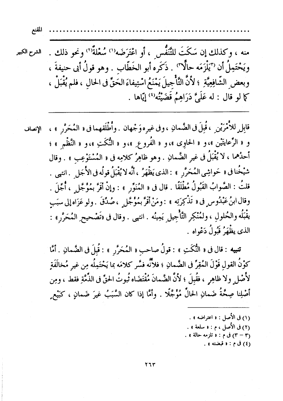 قابِلٍ للأَمْرَيْنِ، قُبِلَ فى الضَّمانِ، وفى غيرِه وَجْهان. وأَطلَقهما فى «المُحَرَّرِ»، و «الرِّعايتَيْن»، و «الحاوِى»، و «الفُروعِ»، و «النُّكَتِ»، و «النَّظْمِ»؛ أحدُهما، لا يُقْبَلُ فى غيرِ الضَّمانِ. وهو ظاهِرُ كلامِه فى «المُسْتَوْعِبِ». وقال شيْخُنا فى «حَواشِى المُحَرَّرِ»: الذى يَظْهَرُ، أنَّه لا يُقْبَلُ قولُه فى الأَجَلِ. انتهى. قلتُ: الصَّوابُ القَبُولُ مُطْلَقًا. قال فى «المُنَوِّرِ»: وإنْ أقَرَّ بمُؤَجَّلٍ، أُجِّلَ. وقال ابنُ عَبْدُوسٍ فى «تَذْكِرَتِه»: ومَنْ أقَرَّ بمُؤَجَّلٍ، صُدِّقَ. ولو عَزَاه إلى سبَبٍ يقْبَلُه والحُلولِ، ولمُنْكِرِ التَّأْجِيلِ يَمِينُه. انتهى. وقال فى «تَصْحيحِ المُحَرَّرِ»: الذى يظْهَرُ قَبُولُ دَعْواه.